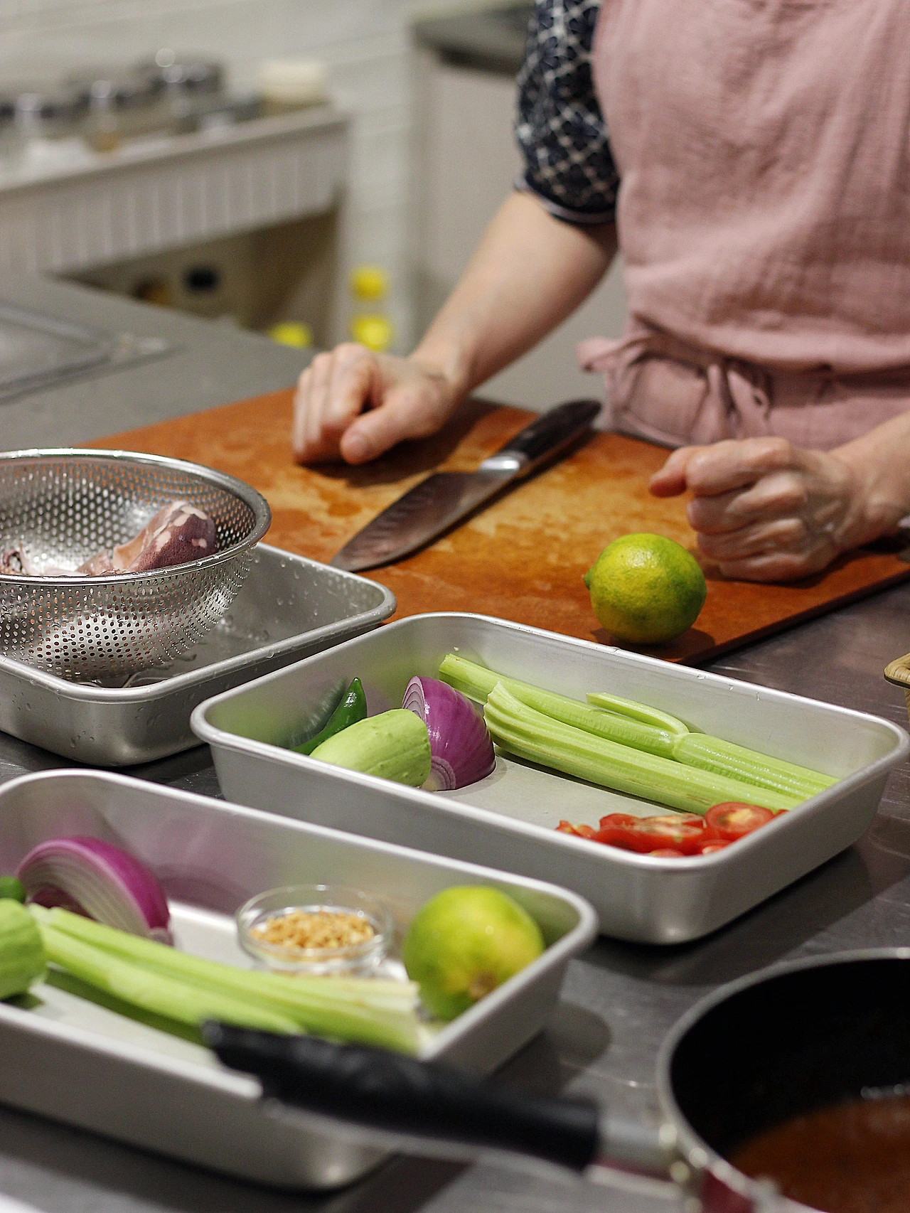 이러다 보니 요리는 하나의 노동이 된다. 나 혼자 먹는 게 아닌, 대접할 사람 수라도 많게 되면 주방에서 준비할 것들은 몇 배가 된다. 요리를 하나의 챌린지 게임이라고 생각해보면 어떨까. 마트에서 장 봐 온 재료들을 일단 넓게 펼쳐 깔아놓고 구분을 지어놓는다. 지금 당장 손질할 것, 지금 바로 씻어야 할 것, 냉동고에 들어가도 좋은 것, 내일 손질할 것 등등. 시간에 구애받지 않는다면 천천히 작업을 시작해도 좋다.