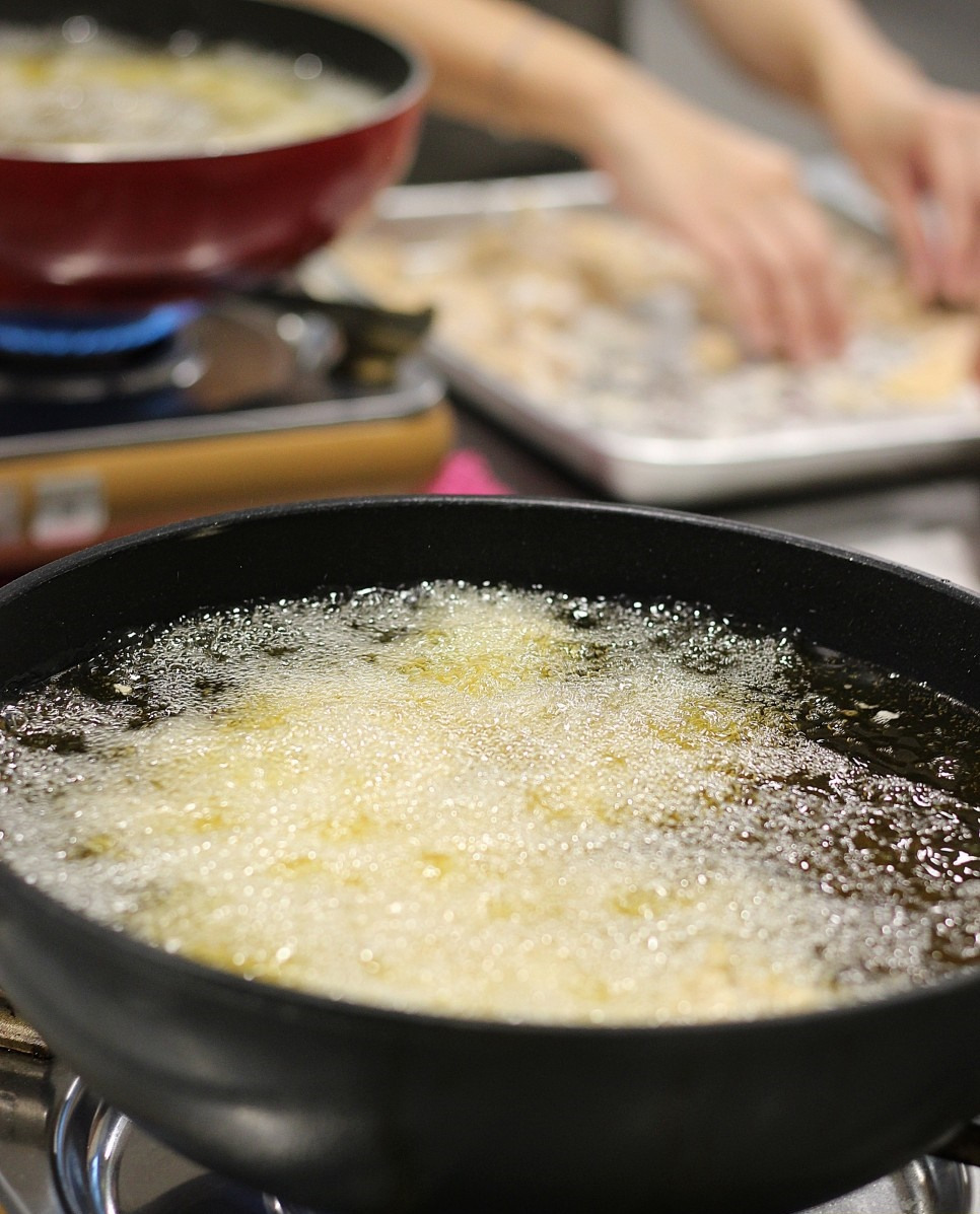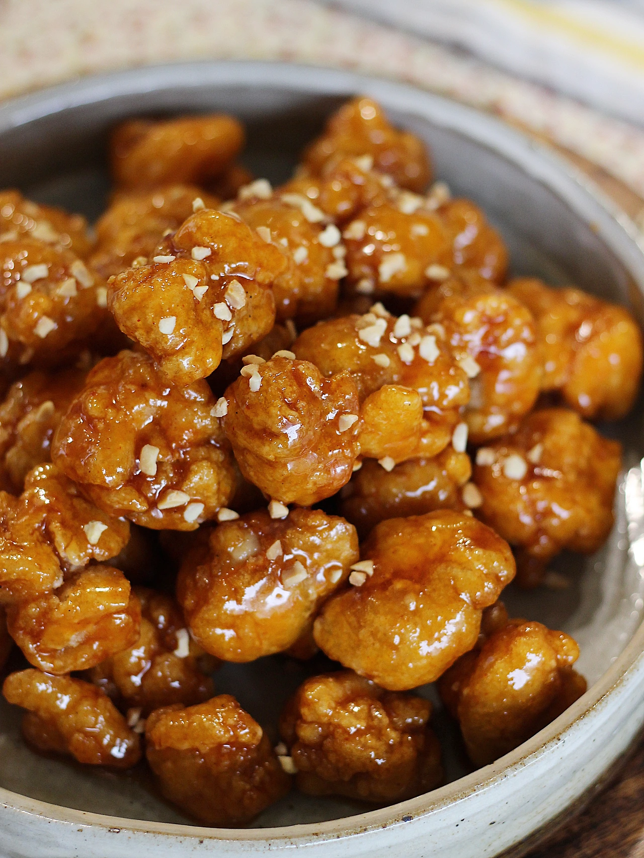 우리 닭강정은 튀김옷이 얇다 못해 살코기가 투명해 비칠 정도다. 충분히 염지한 살코기에 튀김옷이 이렇게도 묻혀지나 싶을 만큼. 그리고 기름에 바삭하게 두 번 튀겨낸다. 닭강정 수업을 들은 또 다른 우리 단골 수강생님께서 하신 말씀이 있다면,