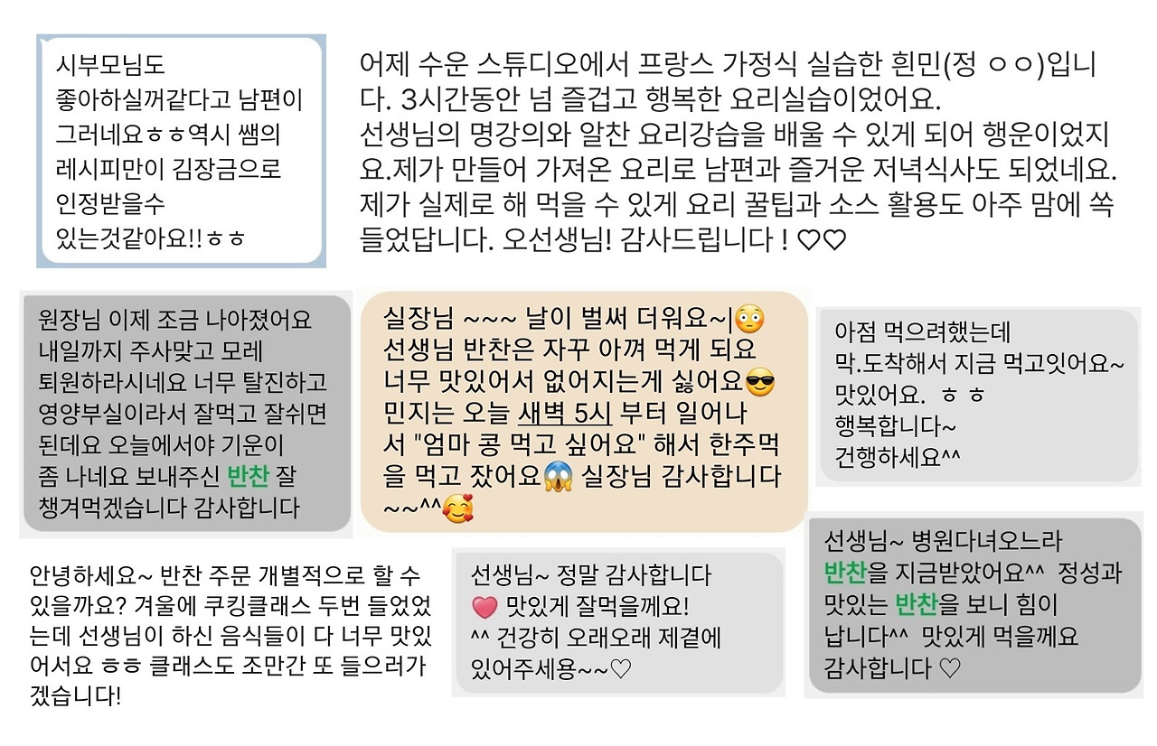 그렇기에 수강생이나 고객들로부터 다양한 연락을 받는 것 또한 내 몫이다. 수업을 듣고 귀가하신 수강생들, 음식을 받아가신 고객들로부터의 따뜻한 피드백도 여럿 받는다. 가끔 표정 변화도 적고, 조용히 말수 없던 분으로부터 아래와 같은 연락이 오면 깜짝 놀라기도 한다.