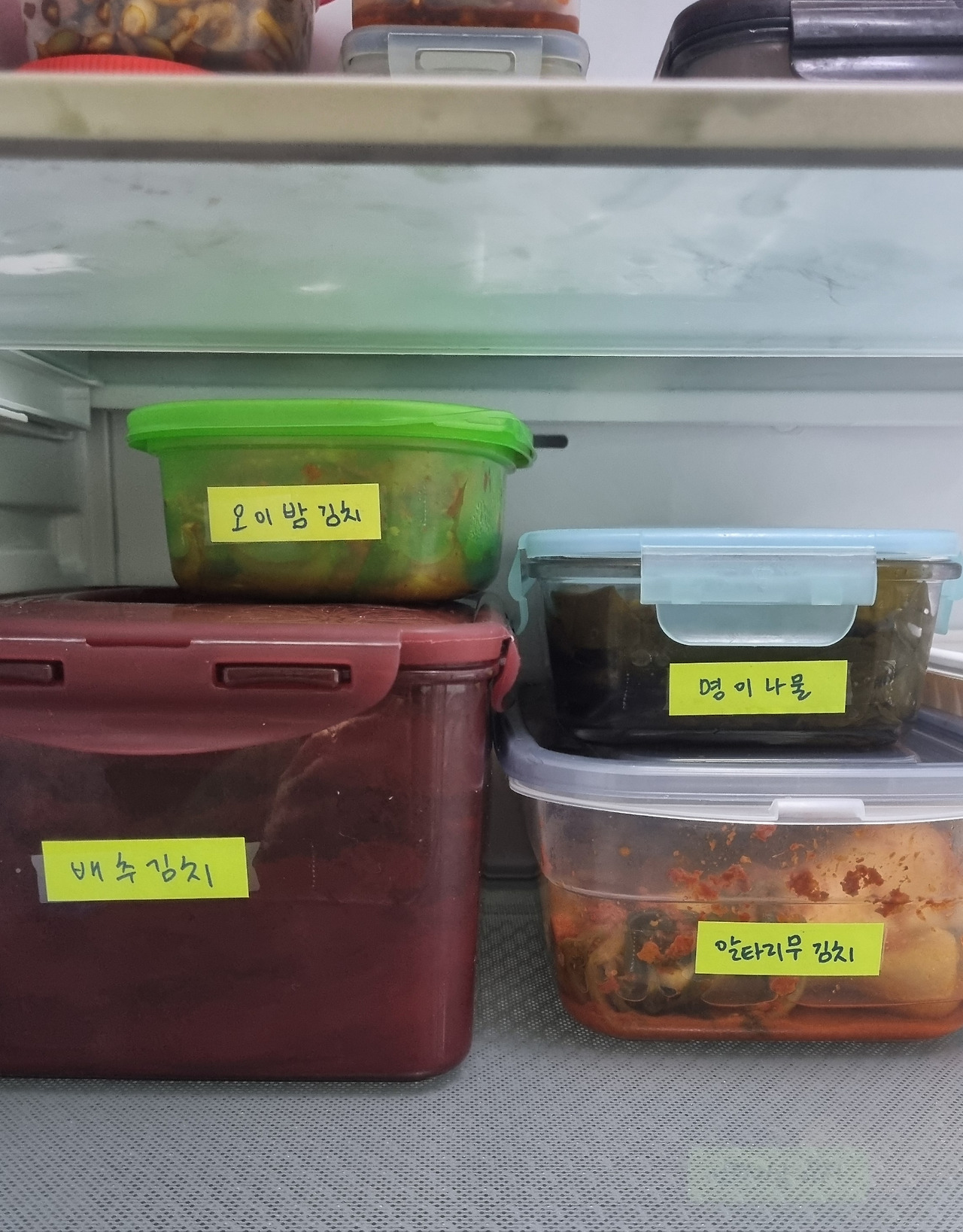 내가 먼저 출근하는 평일 오전과 자리를 비우는 주말에 혹시나 남편이 집에서 혼자 냉장고 열어볼 일이 있을까 해서, 반찬통 용기마다 네임택을 붙여놨다. 물론 불투명한 용기는 뚜껑 열어 확인하면 되지만, 눈에 음식 이름이 들어와야 먹고 싶은 마음도 생긴다고 생각한다.
