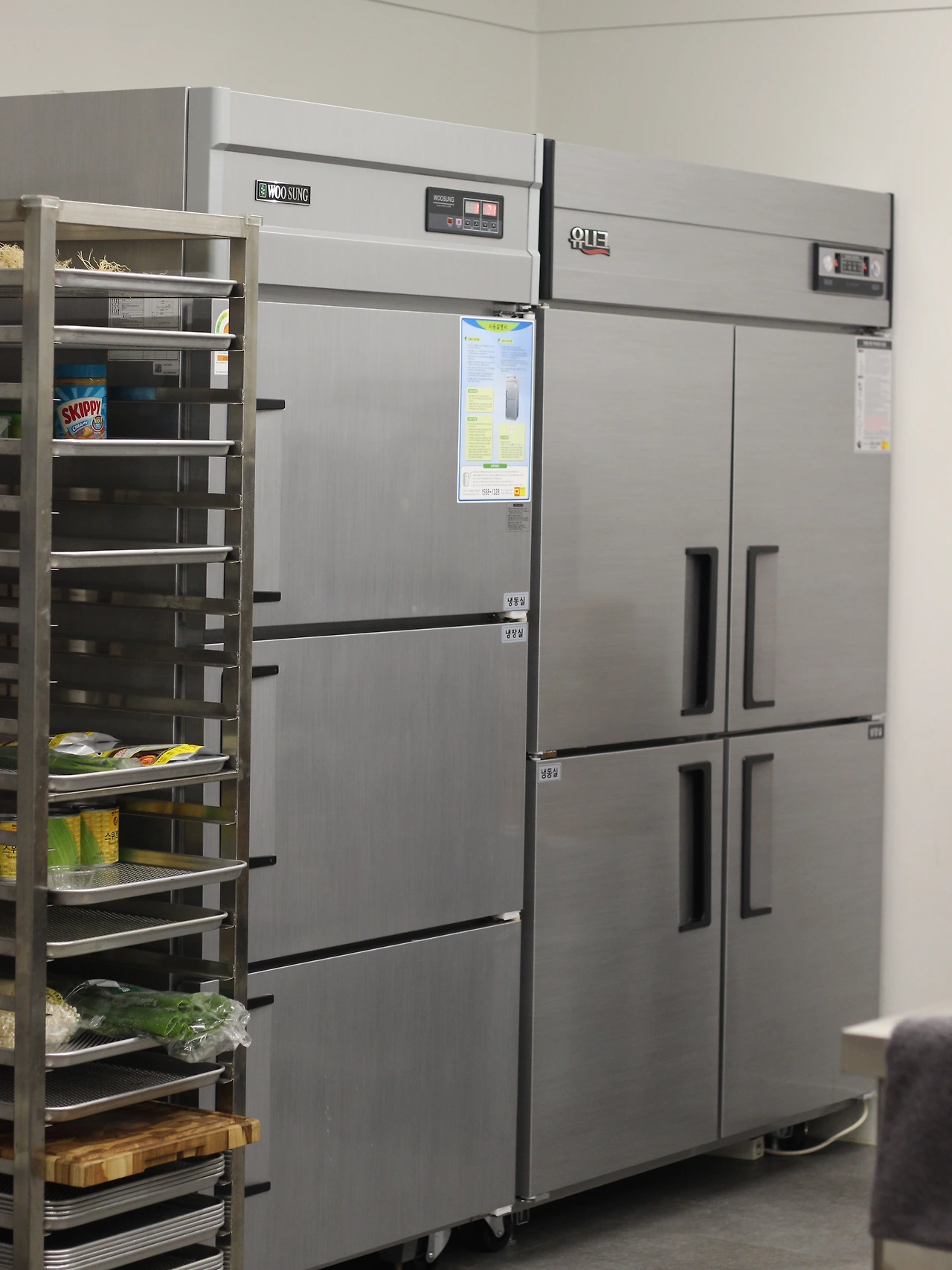 우리 쿠킹스튜디오에는 냉장고, 냉동고만 약 9개가 있다. 그것도 큼직큼직 묵직한 업소용 냉장고, 냉동고들, 스텐 작업대들 아래에 설치한 테이블 냉장고들, 최근 새로 들인 중고 김치냉장고까지.. 그마저도 모자라서 항상 버겁다.