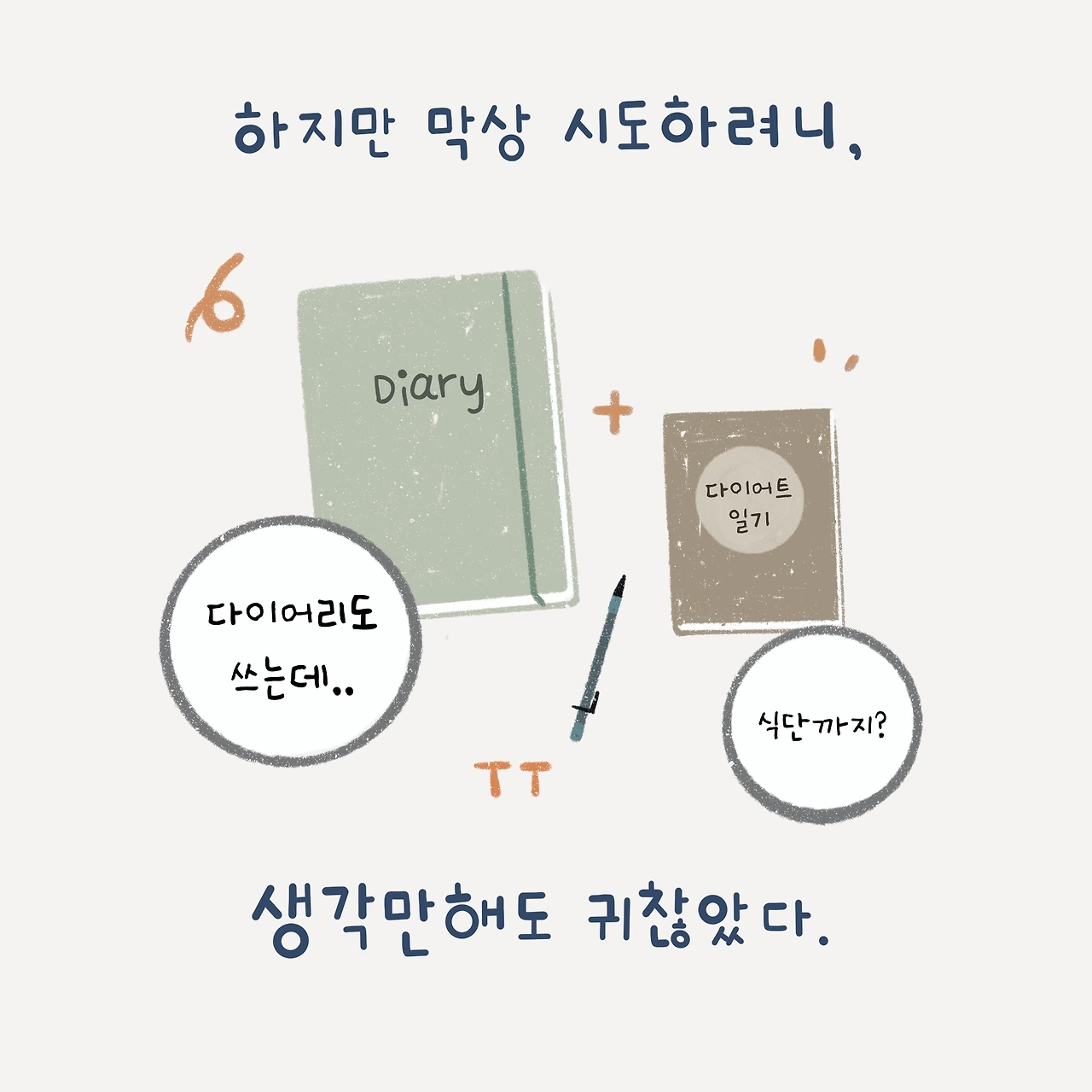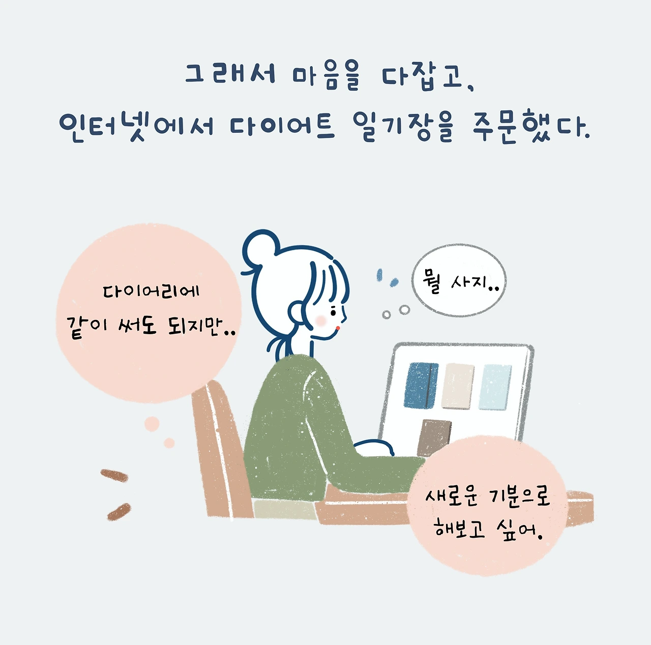 그래서 식단 쓰기를 실행해 보기로 마음먹고, 인터넷에서 가장 무난해 보이고 후기가 많은 적당한 '다이어트 일기장'을 구입했다. 기존의 다이어리에 함께 써도 되지만, 새로운 기분으로 시작하고 싶었기 때문에 일부러 구매했는데, 실제로 쓸 때마다 신선한 기분이 들어 작은 만족감이 들었다.