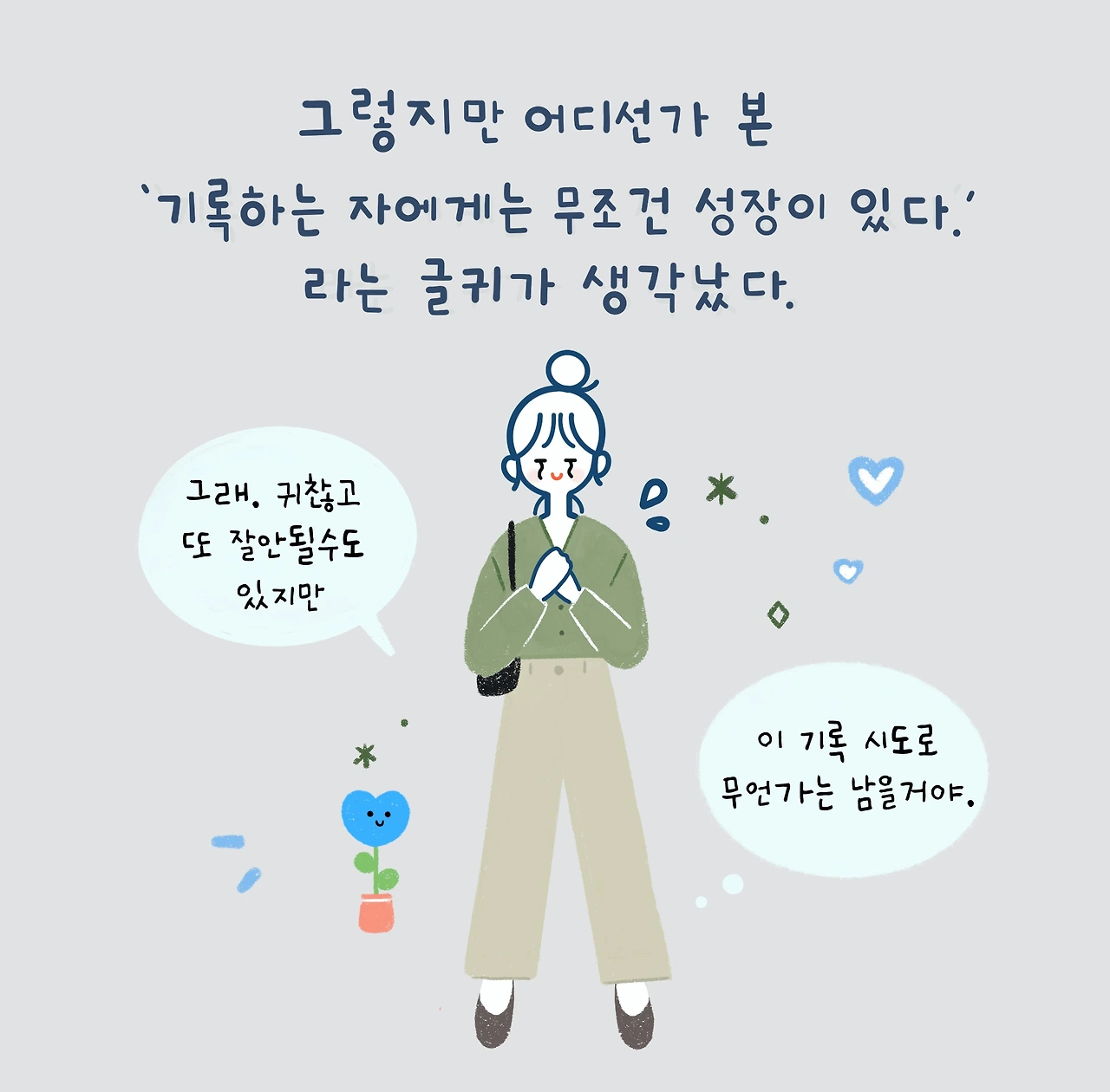 처음에는 무언가 기록한다는 것이 약간의 부담으로 다가왔다. 이미 다이어리를 쓰고 있었는데, 그마저도 매일같이 쓰지는 못하고 있었기 때문이다. 하지만 어디선가 들었던 "기록하는 자에게는 무조건 성장이 있다"라는 문구가 생각났다. 또한 무언가 기록하면서 했던 것 들은 어떻게든 좋은 기억으로 남았던 지난날의 소소한 경험들이 떠올랐다.