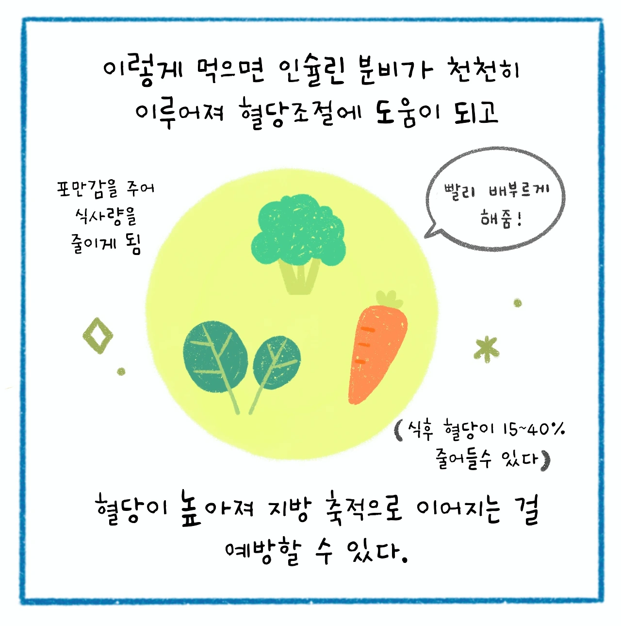 다이어트에 관심 있는 사람은 한 번쯤 '채단탄'이라는 말을 들어본 적이 있을 것이다. 바로 차려져 있는 메뉴 중에 채소, 단백질, 탄수화물 순서로 식사를 하는 것이다. 식이섬유가 가득한 채소는 상대적으로 천천히 소화되고 충분히 씹는 과정을 거쳐야 하기 때문에 뇌에 포만감을 충분히 주고 식사속도도 늦추기 때문이라고 한다. 포만감이 빨리 들기에 전체적인 식사량도 줄어들고, 인슐린 분비도 천천히 이루어져 급격한 혈당 상승을 막을 수 있다. 우리 몸에 가장 빠른 혈당 상승을 가져오는 것이 탄수화물인데, 이미 채소와 단백질을 섭취한 상태에서 탄수화물을 먹게 되면, 탄수화물의 흡수가 천천히 이루어져 급격한 인슐린 분비를 방지할 수 있게 되는 것이다. (당뇨가 있는 사람들의 경우 이런 순서로 식사를 하면 식후 혈당이 15~40%나 감소하는 연구결과도 있다고 한다.) 혈당이 높아지면 지방 축적이 쉽게 이루어지기 때문에 이렇게 식사 순서로 혈당을 관리하는 것이 다이어트에 실질적인 도움이 된다.