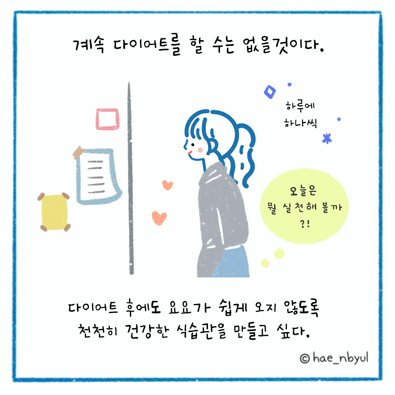 평생 다이어트를 할 수는 없을 것이다. 분명히 어느 기간은 잘 지속될 것이고, 살이 약간 찌거나 조금 느슨해질 때도 있을 것이다. 하지만 이렇게 건강하게 먹는 법을 내 일상으로 만든다면, 요요현상이 쉽게 오는 것을 막을 수 있고 생활 속에서 몸 관리를 하는 건강한 삶의 방식이 될 수 있을 것 같다. "Our food should be our medicine, our medicine should be our food" (우리의 음식은 우리 몸에 약/치유가 되어야 하고, 우리의 약/치유는 음식이 되어야 한다)라는 말이 있다. 건강하게, 즐겁게 먹는 것에 주의를 기울이는 것이 우리의 몸과 마음의 힐링에 얼마나 큰 영향을 미치는지 느끼고 있다. 요요도 막고, 일상도 건강해지는 좋은 식습관이 즐겁게 유지될 수 있었으면 좋겠다.
