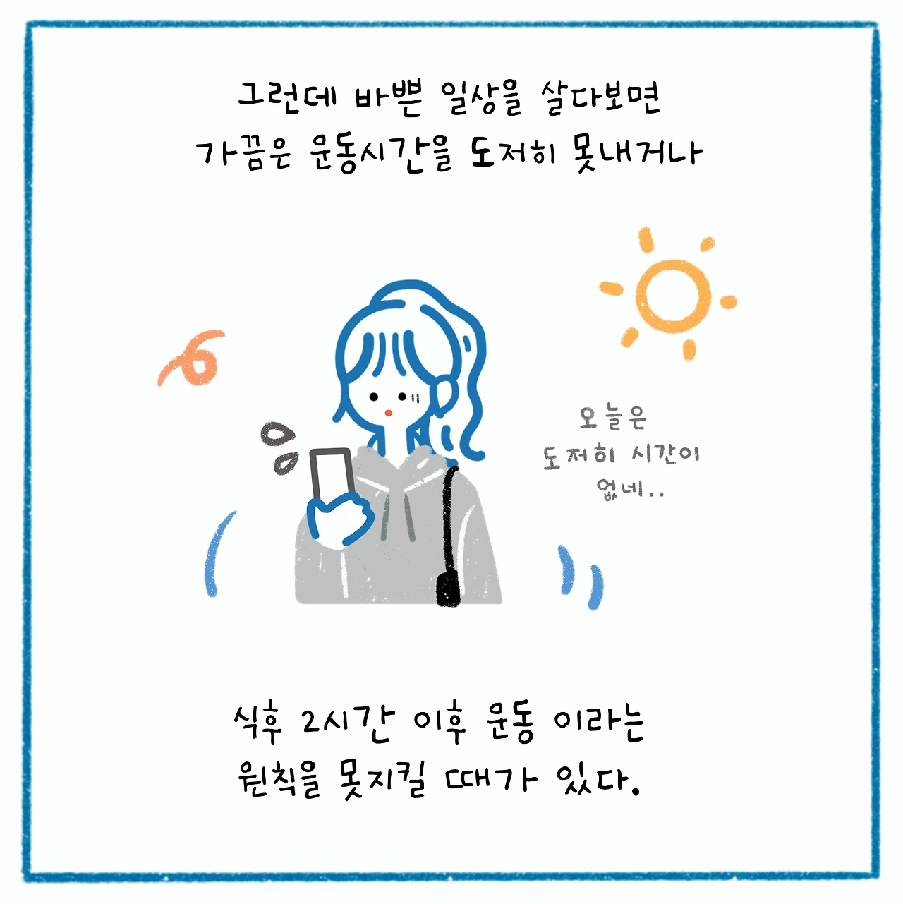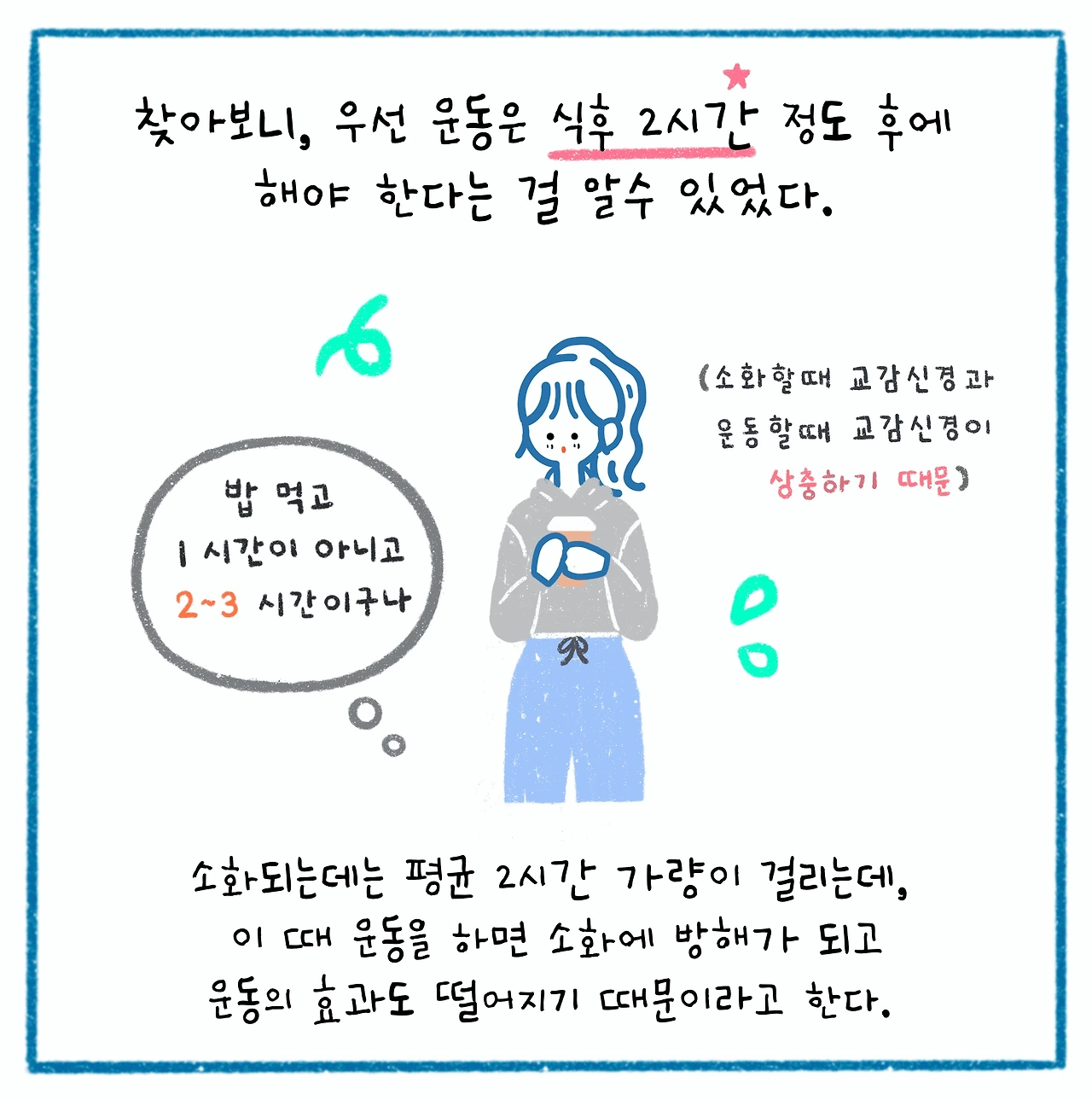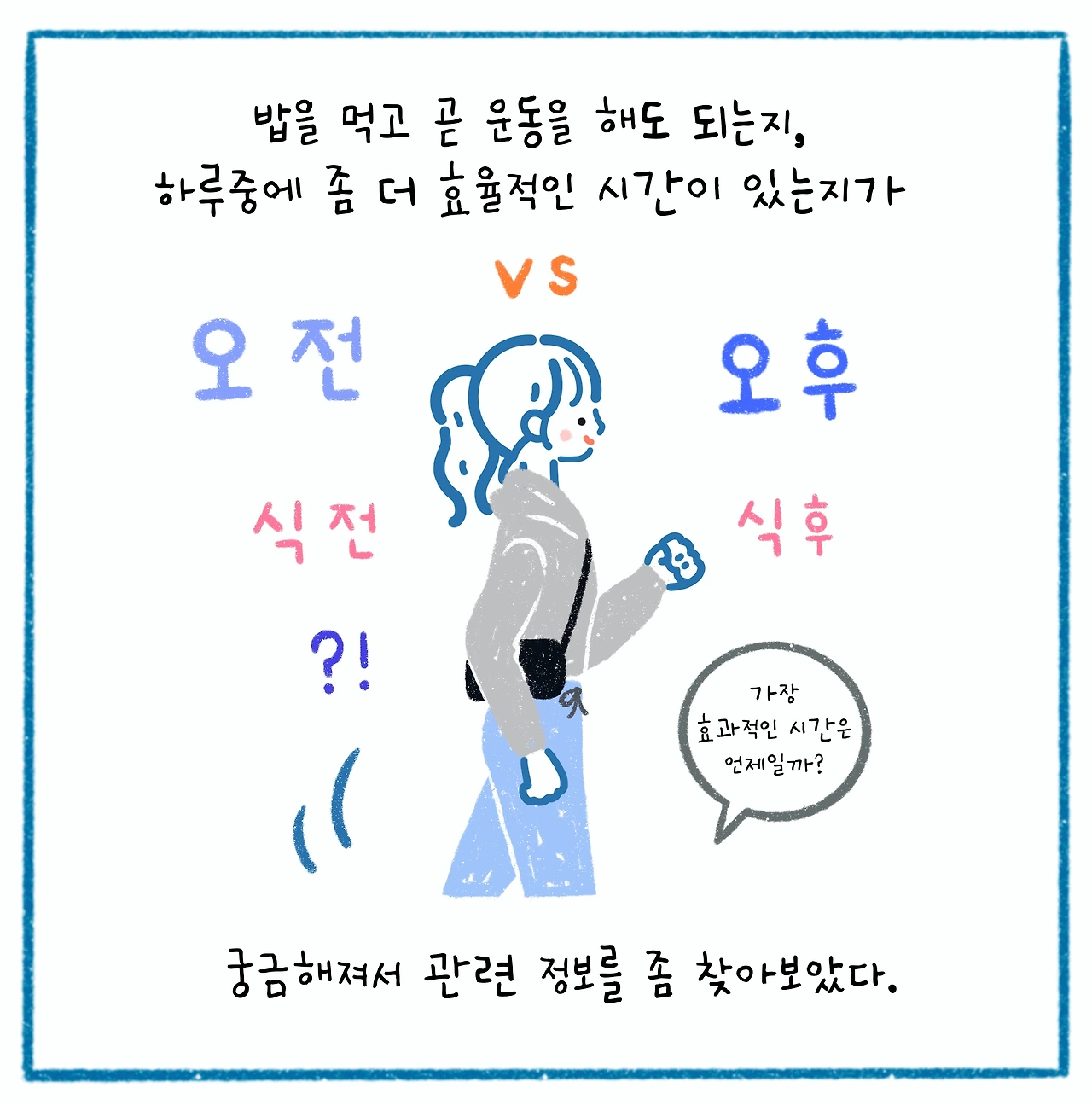 문득 '건강식으로 먹긴 했는데, 밥 먹고 바로 운동해도 될까?' 하는 궁금증이 들었다. 상식적으로 밥 먹고 대략 1시간 정도 후면되겠지 하는 생각이 있었지만, 이왕 하는 운동이라면 효율적으로해보고 싶은 마음에 관련 정보를 찾아보았다.