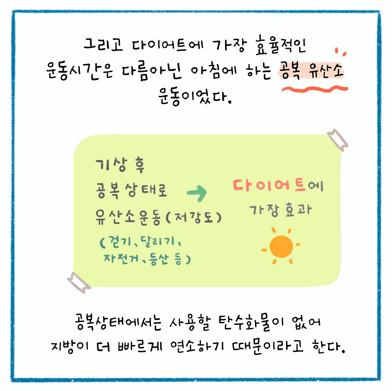 공복 상태에서는 사용할 탄수화물이 없어서 체내의 지방을 에너지로 사용하게 되는 원리라고 한다. 그렇기 때문에 다이어트에 아침 운동이 좋은지, 저녁 운동이 좋은 지를 선택해 보자면 "다이어트를 위한 운동은 아침에 하는 것이 좀 더 효과적이다"라고 할 수 있을 것 같다. 이때 중요한 것은 12시간 이상 공복 상태여야만 하며, 운동은 저강도의 유산소 운동으로 1시간을 넘기지 않는 것이 좋고, 혈당이나 혈압에 관련한 증상이 있는 사람은 유의해야 한다고 한다.