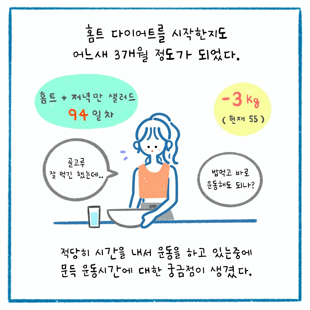 홈트와 약간의 식단을 병행하는 다이어트를 시작한 지 어느새 94일 차, 약 3개월 여가 지났다. 주 2~3회 홈트 40분 루틴에 저녁만 샐러드로 하는 비교적 쉬운 난이도의 계획이다 보니 비교적 순탄하게 유지되고 있다.