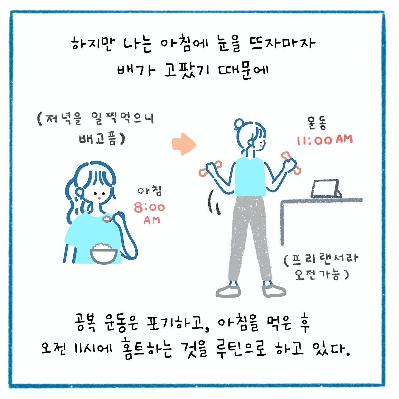 주 3회 40분 홈트와 간단한 식단의 루틴이라는 생각이 들었다. 효과적인 방법을 알았더라도, 결국엔 내가 해낼 수 없다면 소용이 없는 만큼, 아침 8시에 아침식사, 11시에 홈트라는 (프리랜서라 오전 시간이 가능) 현실적인 다이어트 계획을 꾸준히 잘 유지해봐야겠다는 생각이 들었다.