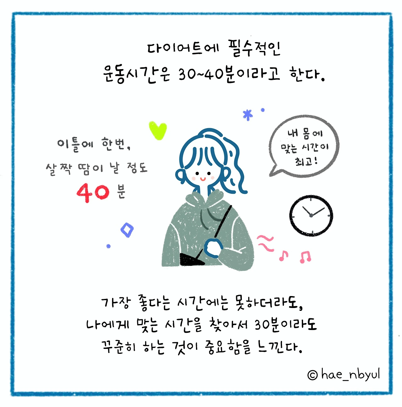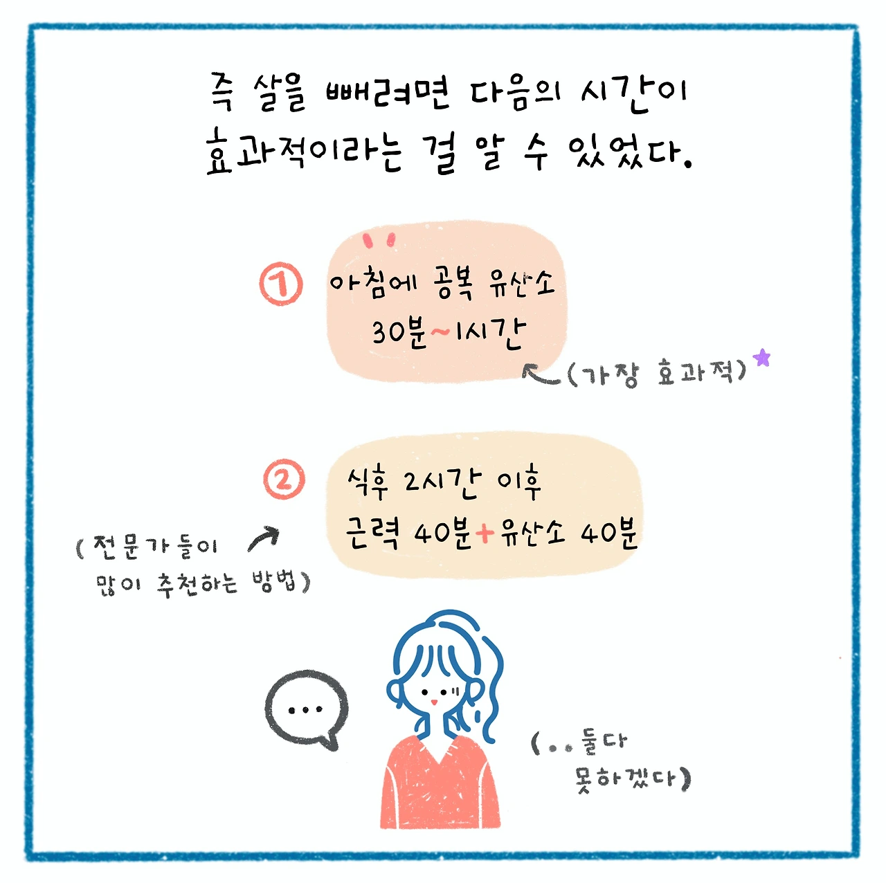 내게 부담되지 않는 강도, 즐겁게 지속할 수 있는 운동 일정이 결국 내게 "가장 살 빼기 좋은 운동 시간"이 되는 것 같다.