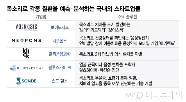 발화 내용 분석을 넘어선 혁신도 일어나고 있다. 음성 디지털 바이오마커 기술은 목소리의 떨림, 음색의 변화, 발음의 명확성 등을 분석해 건강 상태를 진단한다. 목소리만으로 뇌졸중 후 연하장애를 조기진단하고, 치매까지 예측할 수 있다. 보이노시스는 음성 변화를 통해 인지장애, 치매를 조기에 발견하는 AI 기술을 개발하고 있다. 45억 원 규모로 추산되는 치매 조기 진단 시장을 선점하기 위한 움직임이다.