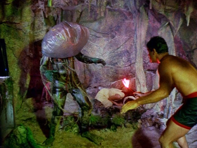 끝없이 이어지는 영혼 없는 장면들, 예컨대 비키니를 입은 여성들의 흔들리는 엉덩이, 60년대 히트곡 중 하나인 ‘Do the Jellyfish’에 맞춰 춤을 추는 젊은이들을 흘려보내다 보면 어느새 영화는 후반부에 도달해있다. 최후의 결투에 이르러서야 그간 모습을 감추고 사람들을 죽이던 크리쳐의 형상이 드러난다. 해파리 괴인은 오리발과 잠수복을 입고 몸에 줄(아마도 촉수를 표현한 듯한)을 주렁주렁 달고 있으며, 동그랗게 부풀어 오른 비닐 풍선 같은 것을 머리에 쓰고 있다. 아래의 사진 속 모습이다.