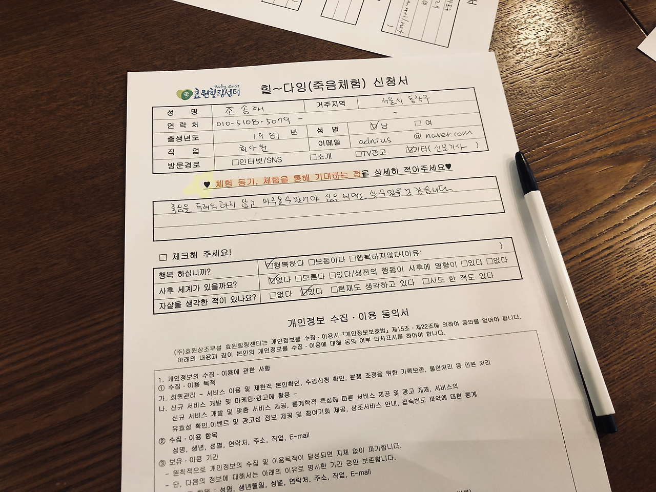 구체적으로 영정사진 찍기, 유서 작성, 입관 체험을 하는 것이고