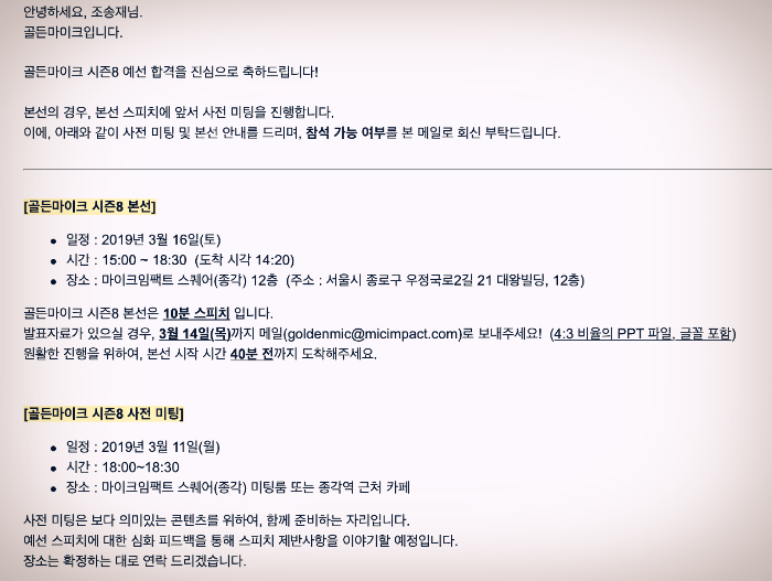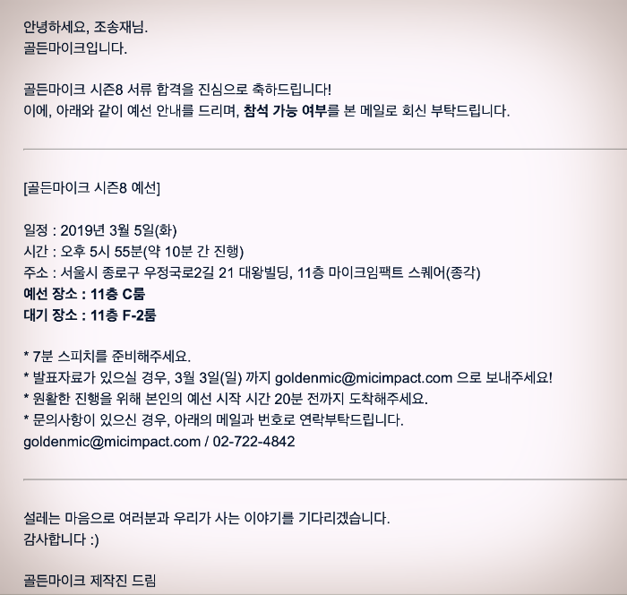 그리고 역시나 이틀 후 본선 진출자 합격 메일을 받았다.