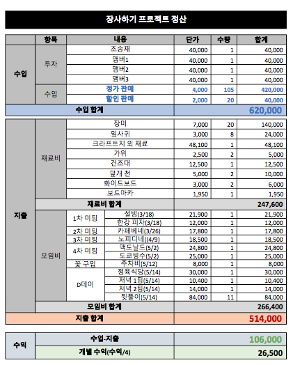 (4,000원 x 105송이 + 2,000원 할인판매 x 20송이)