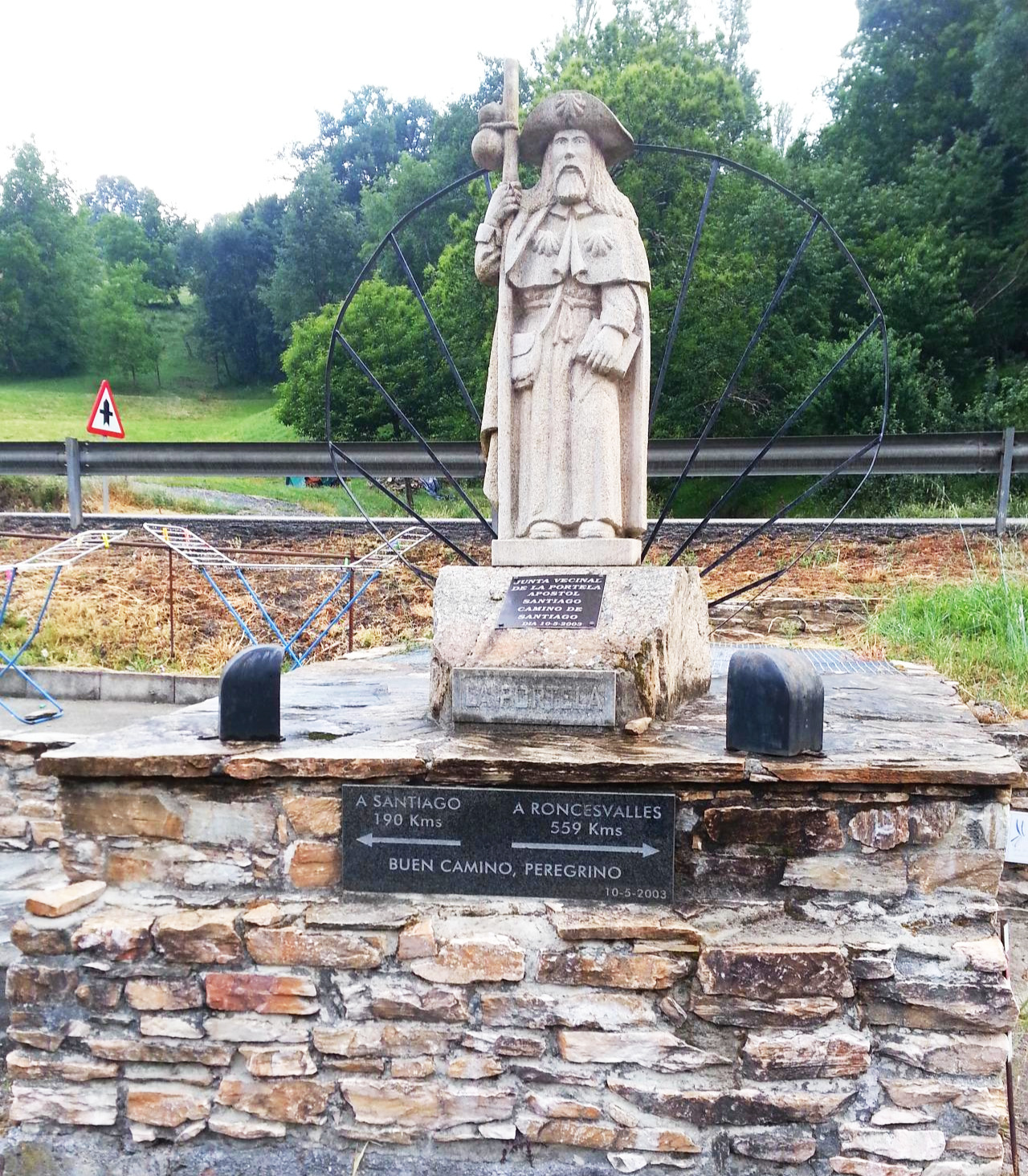 뽀르뗄라(La Portela)의 산티아고 상. 산티아고 델 꼼뽀스뗄라까지 190km가 남았음을 알려주고 있다.