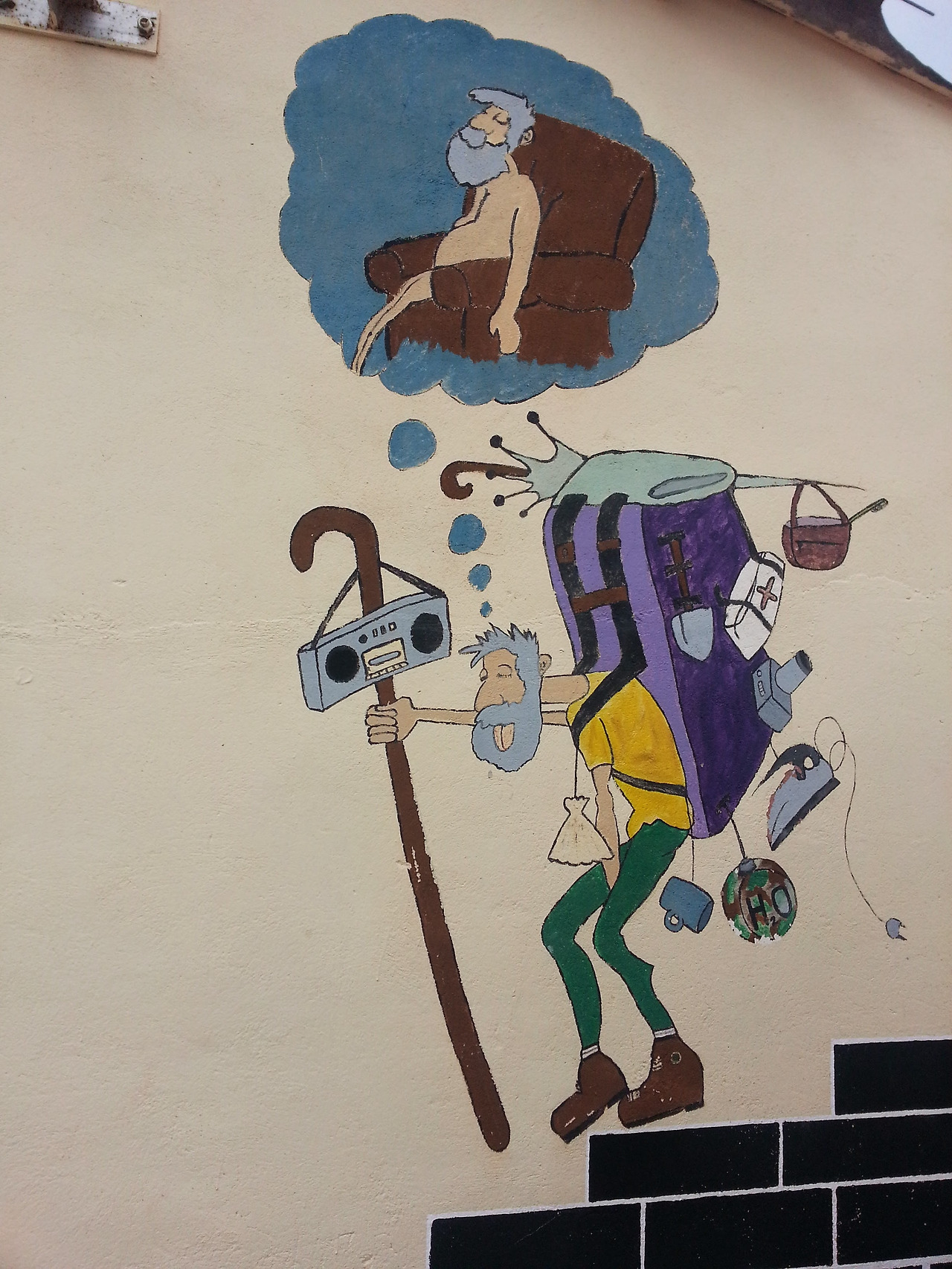 산티아고 순례길을 걷는 순례자를 표현한 그림. 괜한 욕심에 필요없는 물건까지 다 짊어지고 걸으면서 머릿 속으로는 편안하게 쉬는 것만 생각하는 어리석은 인간을 풍자한 것이다.