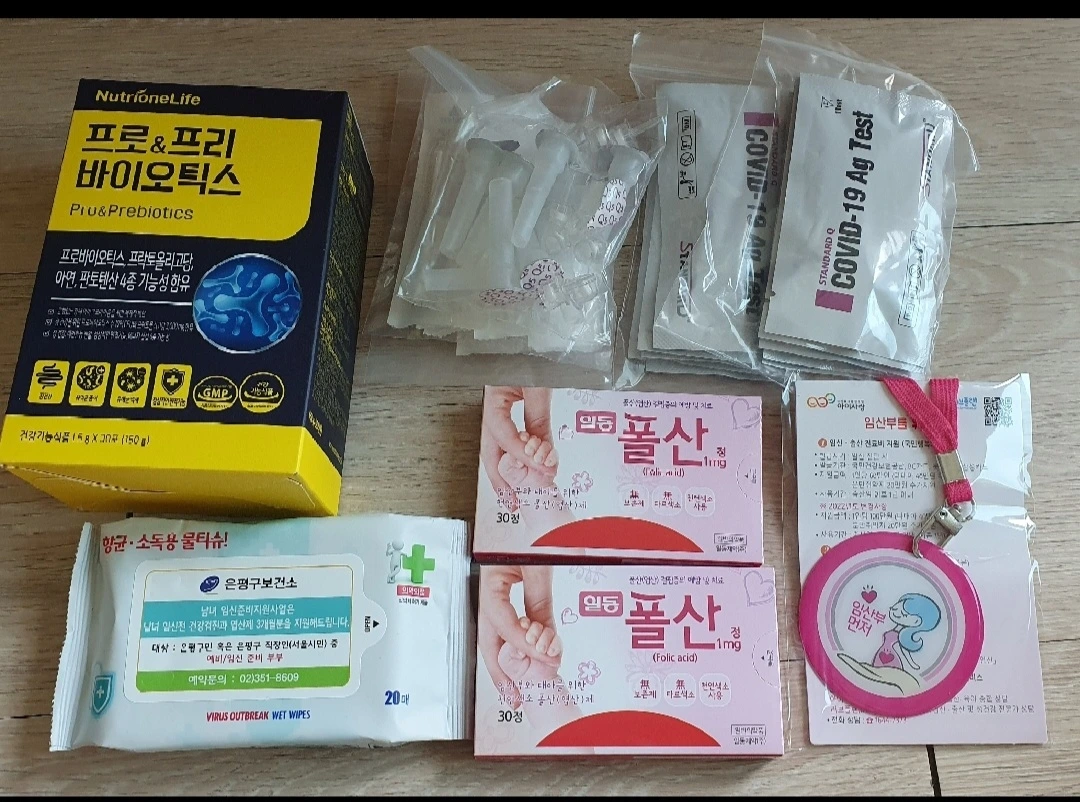 우리 구 보건소는 엽산 2개월분, 유산균 1통, 소독 물티슈, 임산부 배지, 코로나 자가검진 키트 10세트를 준다.