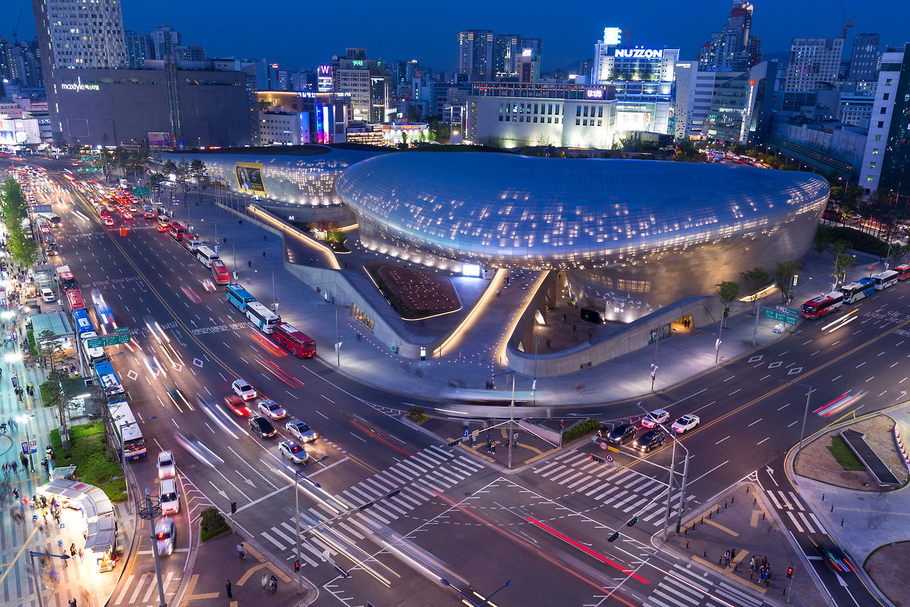 DDP는 이라크에서 태어난 영국의 건축가, 여성으로선 드물게 세계적 스타 건축가의 대열에 선 자하 하디드의 작품이다. 우주선 같은 유선형이 그의 건축의 특징. 안타깝게도 지난 3월, 세상을 떠났다. 처음 DDP가 만들어질 때 그 모습이 주변과 어울리지 않는다는 비난이 쏟아졌으나 지금은 명실상부 서울의 랜드마크로 외국인 관광객에게 사랑을 받고 있다. 1층엔 LED 장미정원이 있다. 총 2만5550송이로, 70에 365를 곱한 수다. 대한민국이 광복을 맞은 지 70주년이 되는 해를 기념해 만들어졌다. 동대문을 찾는 사람들이 꼭 찾는 포토존이다.
