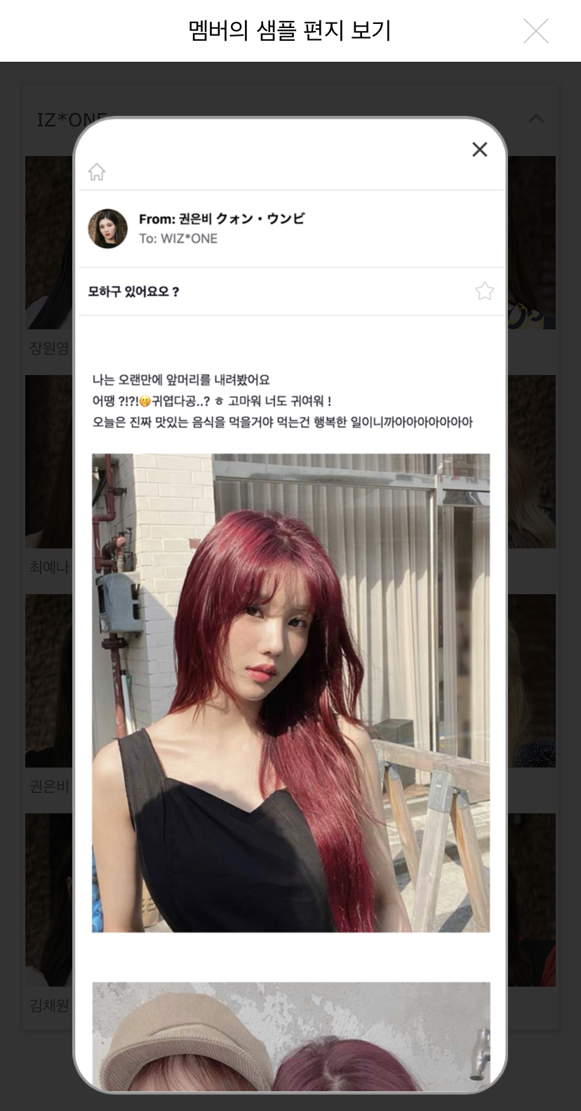 까지 이어지는 저의 여돌 최애 라인 중에서도 권은비를 정말 정말 좋아한다. 내 친구들이라면 아마 다 알고 있을 거고 주변 사람들이 내가 권은비 얘기하는 걸 듣더니 진심이네 찐이네.. 할 정도긴 하지만 난 덕질하지 않는다고 생각한다. 아직 내가 생각한 덕질 기준을 통과하지 않았기 때문이다. 여하튼, 권은비를 진짜 진심으로 좋아하는데 올 두 달 전 즈음에 엄청 고민하다가 유료 구독 서비스 체험 겸해서 아이즈원 메일이라는 걸 처음으로 구독하기 시작했다. 구독한 그다음 날부터 200% 만족하고 있는 서비스인 아이즈원 메일 뭐가 좋았고 뭐에 놀랐는지 말해보려고 한다.