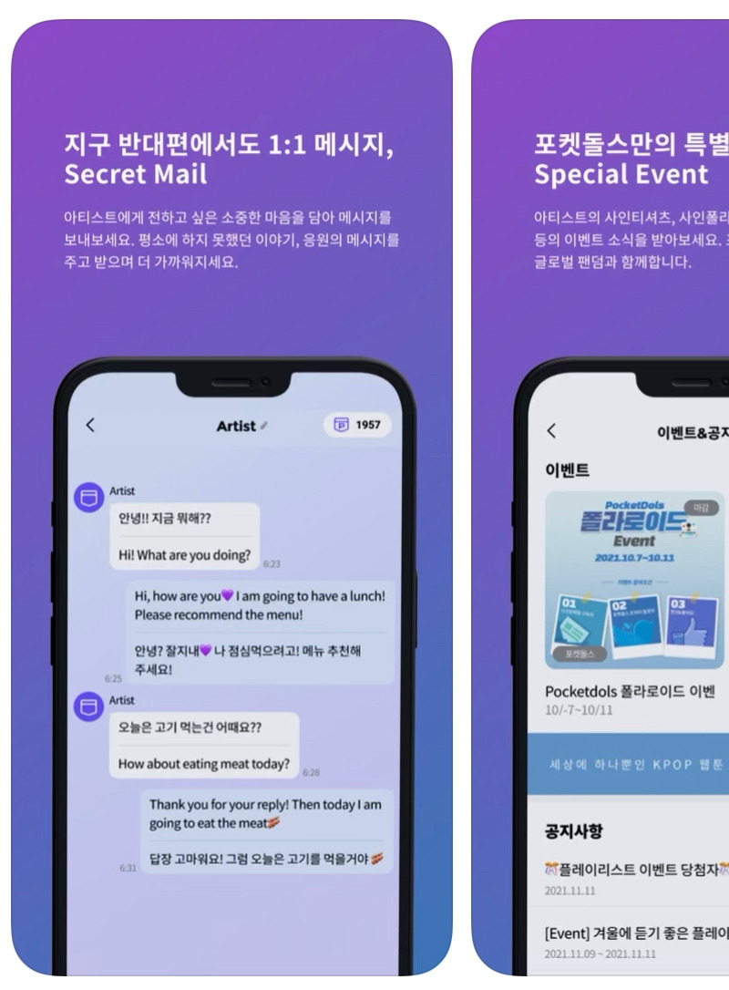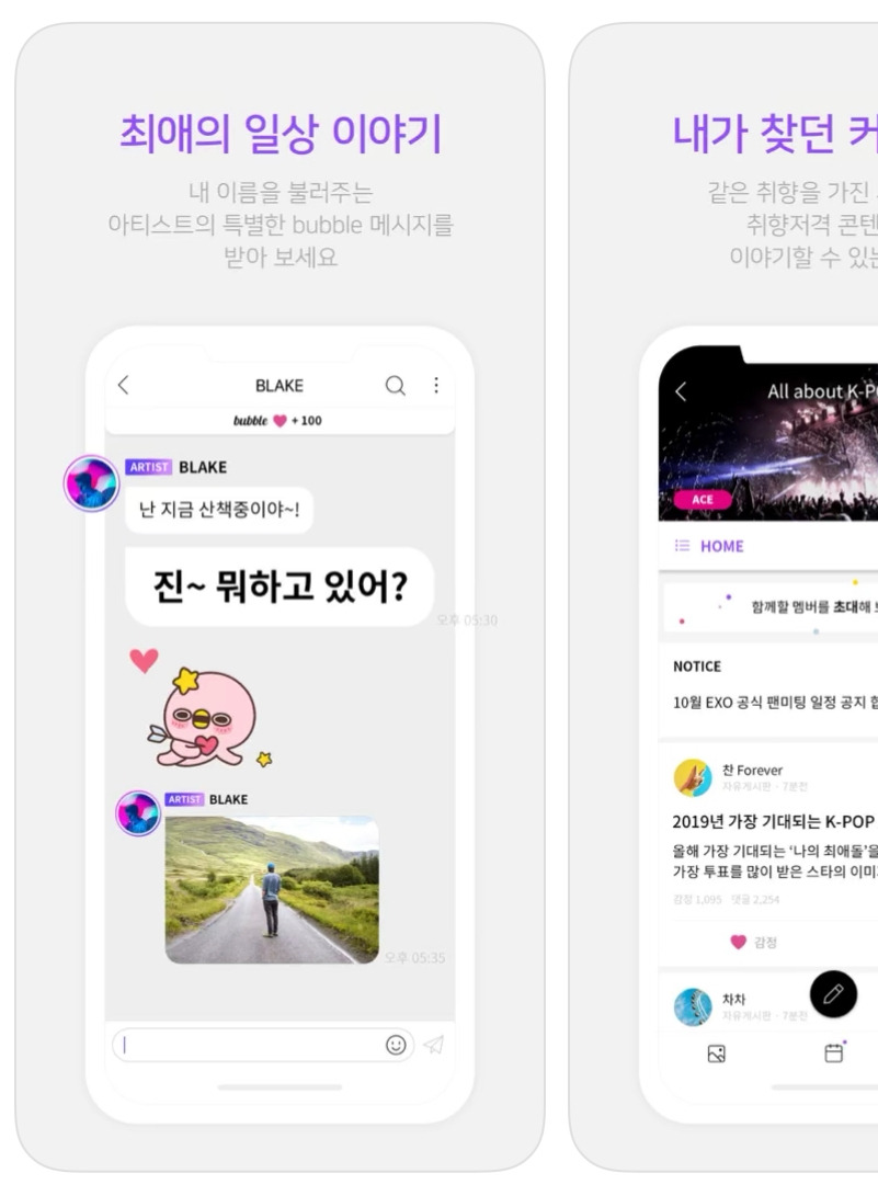 버블은 이제 고유명사가 됐다. 버블 왔다! 아티스트에게 버블 메시지가 왔다는 말이다. 쉽게 말하면 아티스트와 카톡 하는 느낌이라고 생각하면 된다. SM에서 운영하는 리슨 앱을 다운로드하면 그 안에 들어온 아티스트들을 구독하여 프라이빗 메시징 서비스를 받을 수 있는데, 이걸 '버블을 구독한다'라고 말한다. 아티스트 별로 앱이 다르다. SM 아티스트들이 들어가 있는 앱이 있고 JYP 아티스트들이 들어가 있는 앱이 있다.