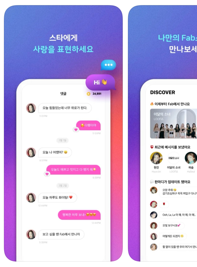 아티스트는 이와 같은 소통 전용 플랫폼에 중복으로 들어가 있지 않으며 반드시 하나의 플랫폼과 독점 계약하는 것으로 보인다. 이 셋 말고도 포켓돌즈와 팹이 있는데 위버스, 버블, 유니버스가 구독형 서비스인 것과 다르게 포켓돌스는 내가 메시지를 보내는 만큼 돈을 내고 개인 답장이 가능하기 때문에, 예전에 한참 유행했던 유타와 비슷하다고 보는 사람들도 많다. 이달의 소녀가 들어가 있는 팹은 버블과 포켓돌스를 섞어놓은 느낌인데, 답장을 보내는 만큼, 팹을 조회하는 만큼 금액이 차감된다고 알고 있다. 이 앱 또한 개인 답장이 가능하고 이달의 소녀가 열심히 소통한 덕분에 사람들에게 많이 알려지고 있다.