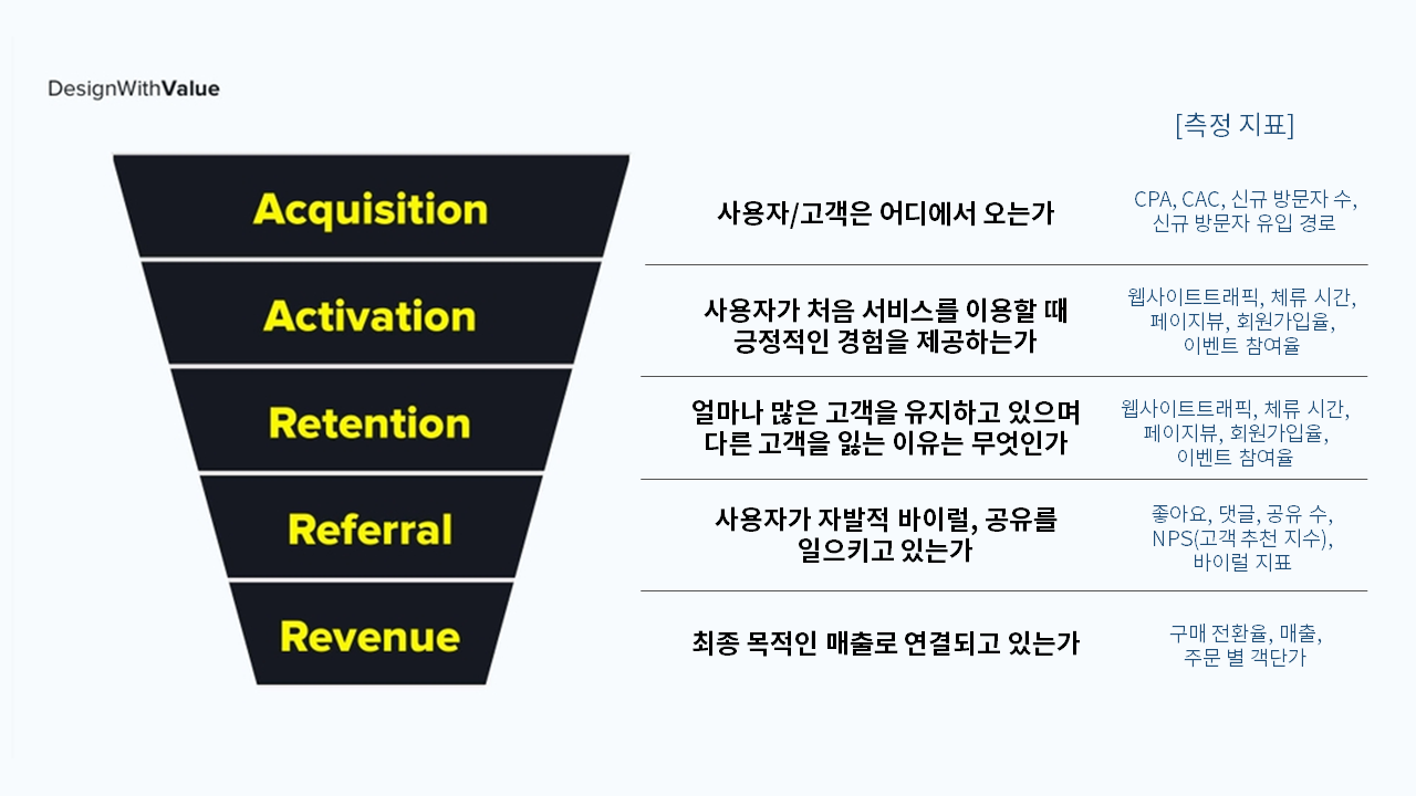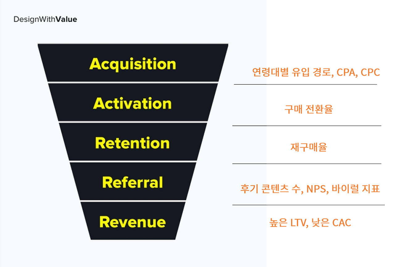 그로스 해킹의 궁극적인 목표는 잠재고객을 입소문 효과를 내는 핵심 고객으로 전환하는 것이다. 여기서 전환율을 측정하기 위해 사용되는 것이 깔때기 형태의 퍼널 분석이다. 퍼널 분석을 스타트업과 신규 프로덕트를 구축한 후 빠르게 검증하게끔 활용하게 발전된 것이 AARRR 지표이다.