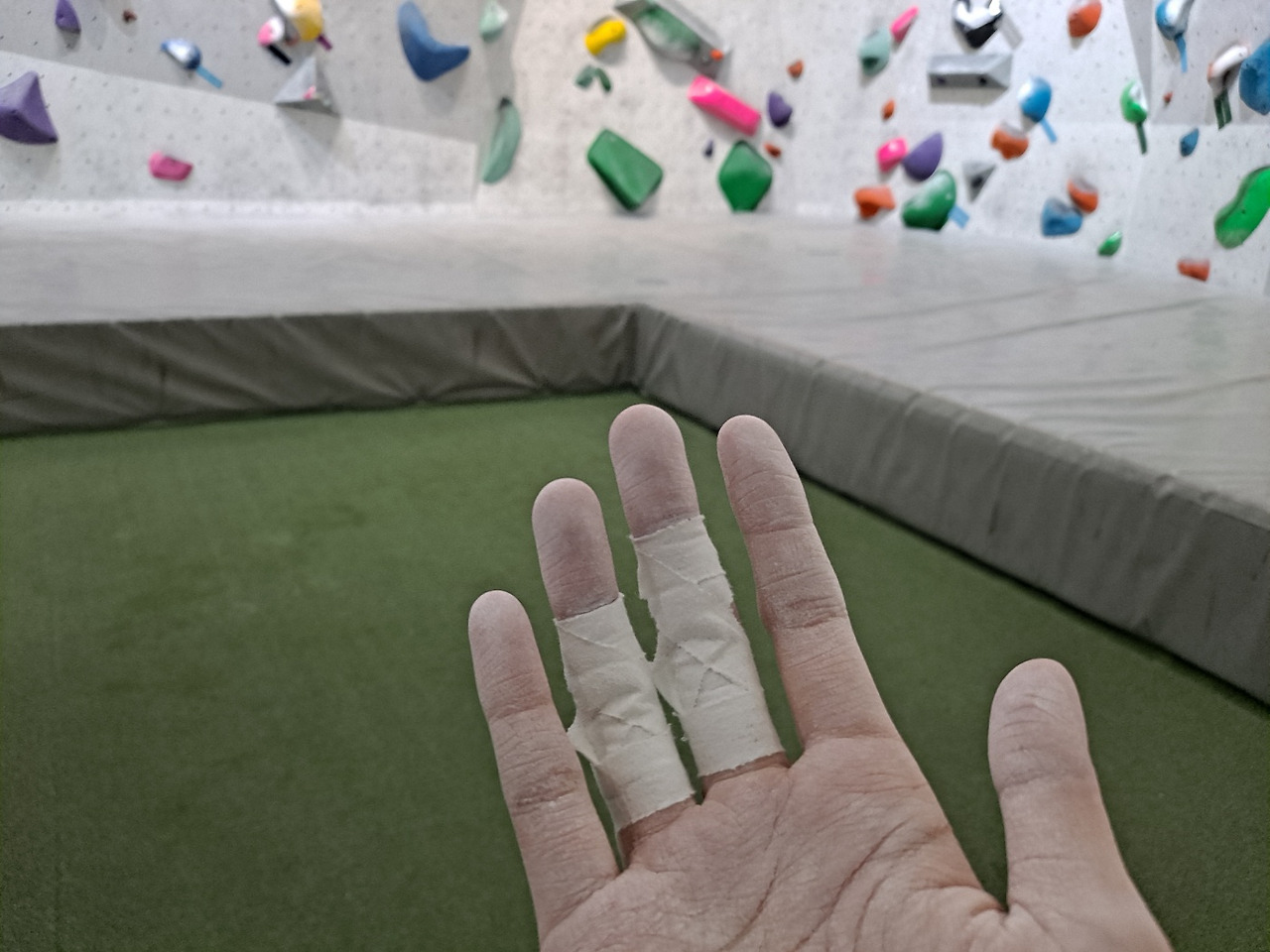 해당 시간에 신청한 사람이 나밖에 없어 운 좋게 1대1 강습을 받게 되었다. 강사님께서 자주 쓰이는 관절을 보호하기 위해 간단하게 테이핑을 해주셨는데 폼만 보면 운동 자주 하는 사람이 된 것 같아 의욕이 더 샘솟았다. 미끄럼 방지를 위해 초크까지 묻히니 더 그럴싸해 보여서 쭈구렁 마음은 사라지고 초심자의 열정이 불타올랐다.