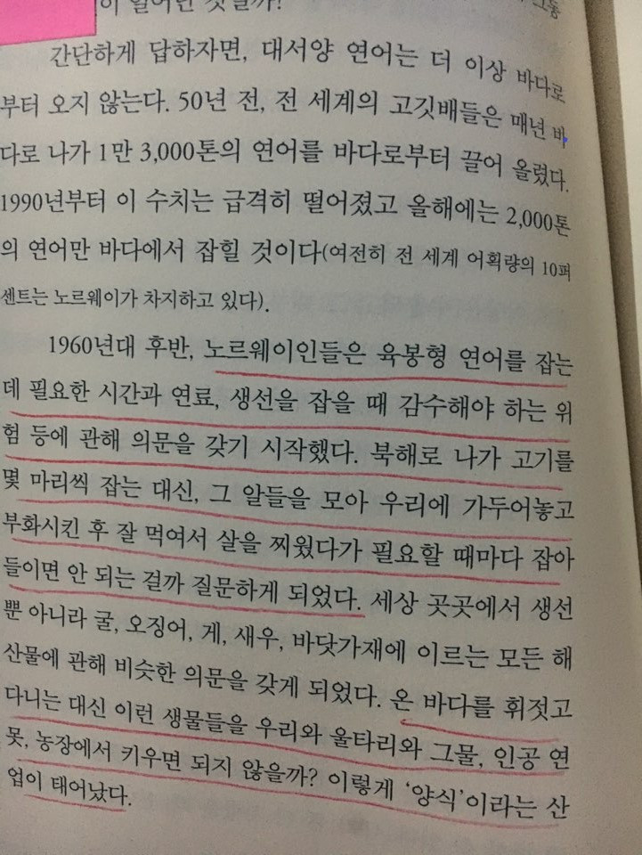 우리나라뿐만 아니라 전 세계적으로 양식업은 많이 발달했다. 노르웨이의 경우 연어를 잡는데 필요한 시간, 비용, 그리고 위험을 줄이는 방법으로 연어 양식업에 눈을 돌렸다. 가두어 놓고 기르니 목숨 걸고 바다를 나갈 일도, 빈손으로 돌아올 걱정도 없어졌다. 할 일이라곤 질 좋고 맛 좋은 상품을 위해 풍부한 먹이와 좋은 환경을 제공하는 것 정도다. 아, 되도록 빨리, 또 크게 만들어서 좋은 상품으로 팔기 위해서 사료를 아끼지 않는 것도 잊지 않는다. 참고로 1마리의 연어를 키우기 위해서 필요한 먹이 양은 연어의 3배가 된다고 한다. 나의 먹거리가 풍족하게 먹기 위해서는 연어가 그만큼 더 많은 먹이를 먹어야 하는데 아무래도 바다의 절반이 양식장이 되어도 모자랄 듯싶다.