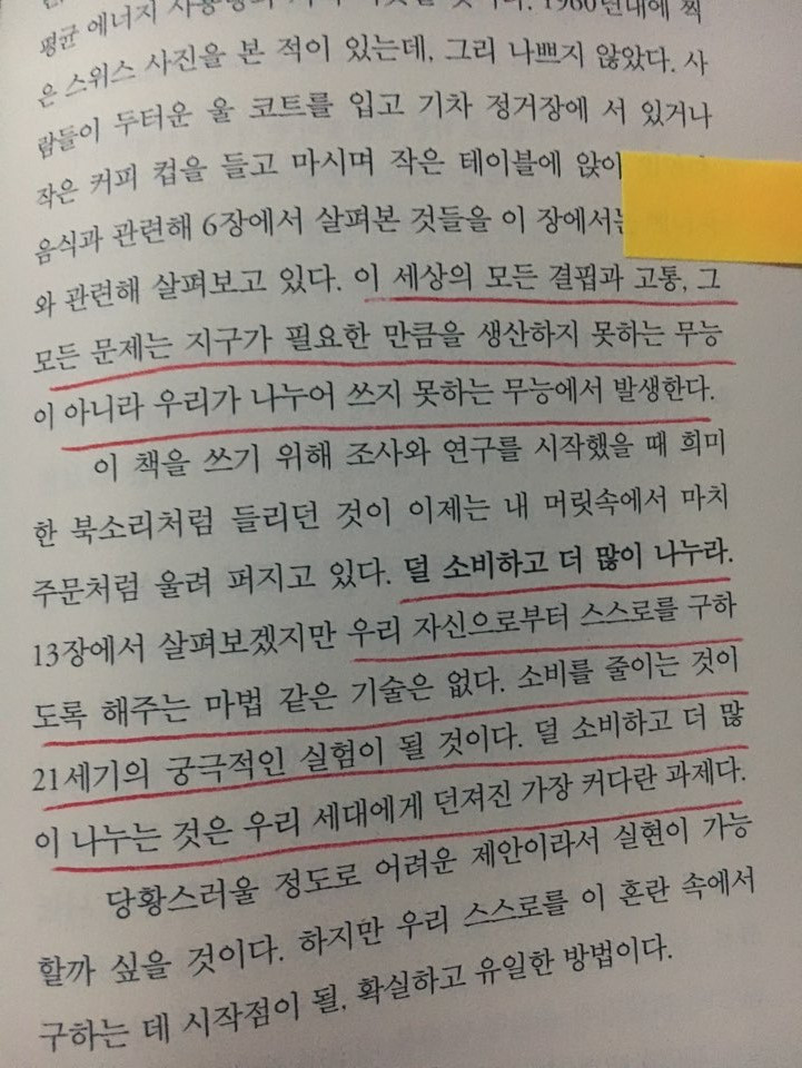 적어도 소비를 자랑하고 풍요로움을 권장하는 한 지구는 지금보다 훨씬 더 달라질 것이다. 더 빈곤해지고 더 잔인하게 말이다. 수많은 환경가와 과학자들이 하는 경고와 자연이 보내는 싸인을 외면하지 말아야 한다. 생각보다 지구는 강하고, 세고, 자정작용이 뛰어나다는 나태한 태도는 지구를 위해서 전혀 도움이 되지 않는다. 지구는 버틸 만큼 버텼고 참을 만큼 참았다. 얼마나 더 참아야 하는 건가?