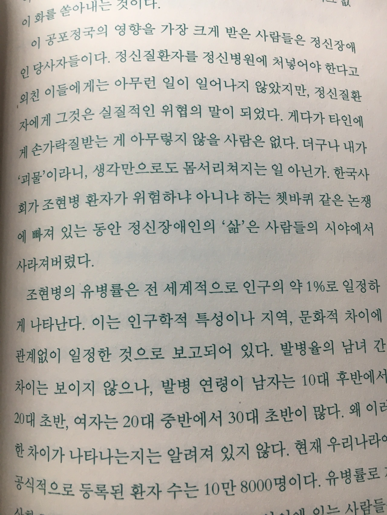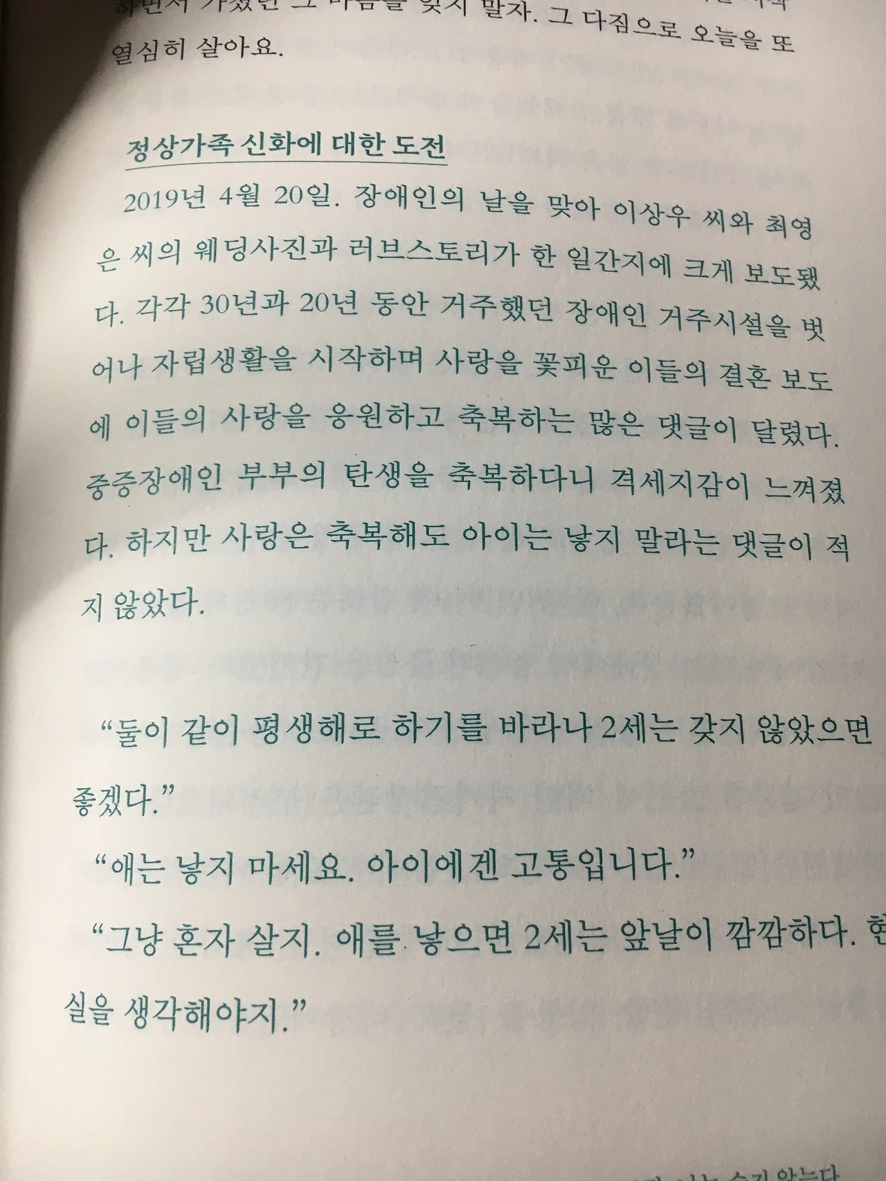 숨기는 것이 정말 답일까, 이게 정말 최선일까? 묻고 또 묻는다. 무엇의 답이고 누구를 위한 최선인가. 다수는 누구이고 소수는 누가 결정하는가. 분명한 건 소수는 스스로를 결정하지 않는다. 오로지 결정될 뿐이다. 그러나 소수를 결정하고 이들을 부정하는 것보다 더 나쁜 건 이들의 존재 자체를 인정하지 않는 것이다. 아예 없다고 생각하는 것. 이 세상에 존재하는 않는 것으로 여기는 것. 존재를 들키지 않기 위해 침묵을 요구하는 것. 이런 방식으로 수많은 장애인, 정신적 질환을 가진 환자, 이혼 여성, 홈리스, 탈가정 여성들은 점점 깊은 곳으로 숨어 들어가야 했다.