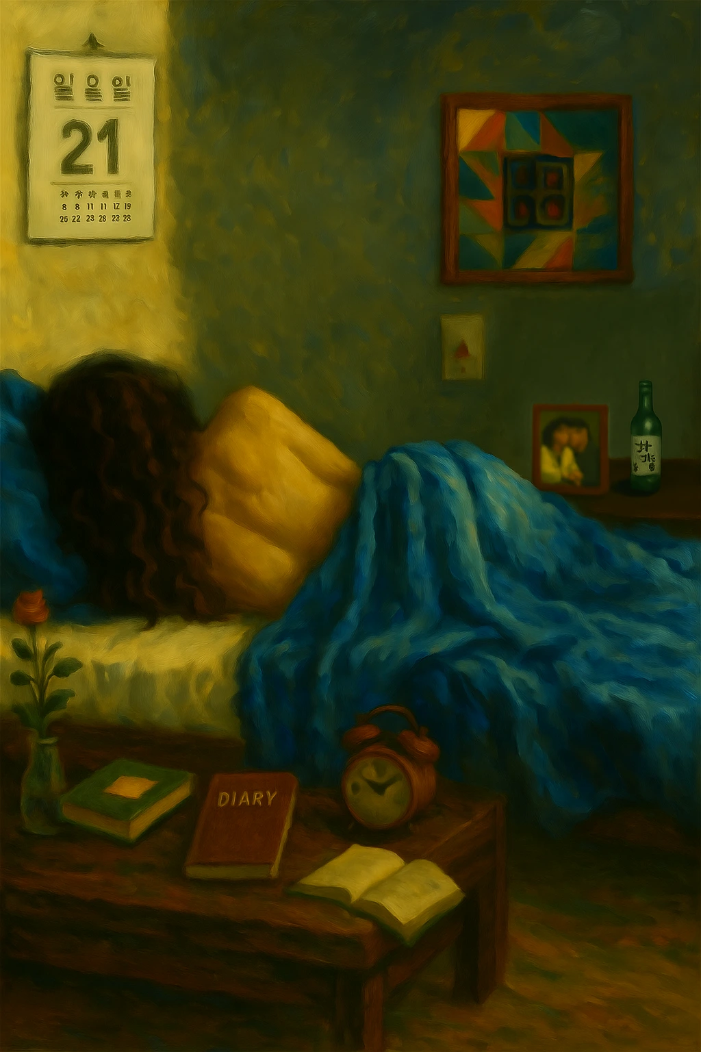 침대는 피난처이자 함정이 되었고, 그 안에서 나는 꿈과 악몽 사이에 가라앉았다.