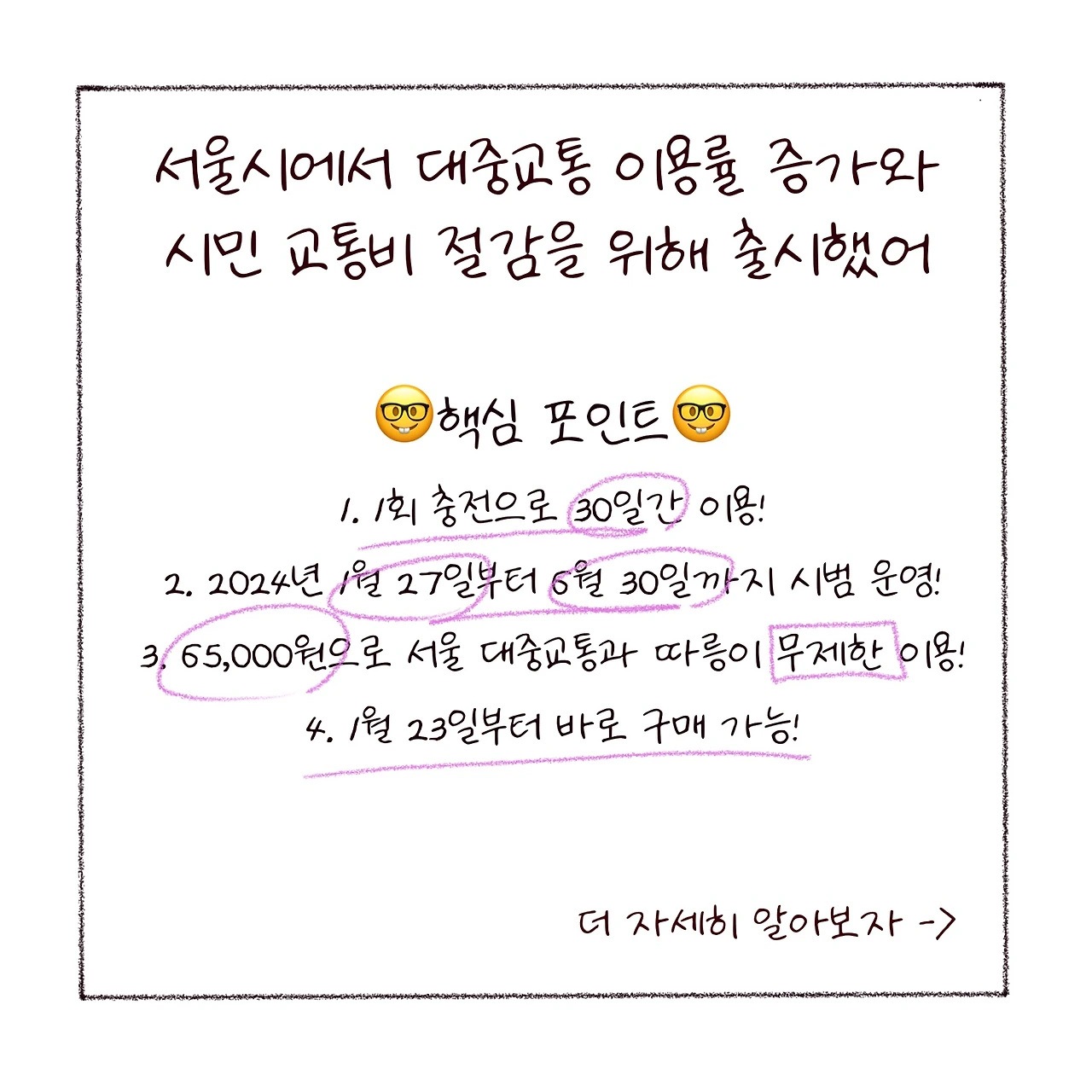 이런 우리를 구원해 줄 서울시의 ‘기후동행카드’가 등장했습니다! 1회 충전으로 30일간 서울시내 대중교통과 따릉이 무제한 이용이 가능한 카드이고, 가격은 무려 65,000원!!!