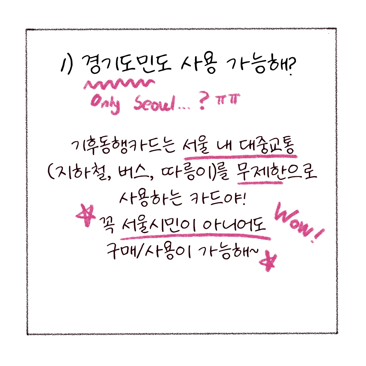 오늘은 요즘 제일 핫한 갓성비 교통카드 기후동행카드에 대해 주로 궁금한 내용들을 알려줄게!