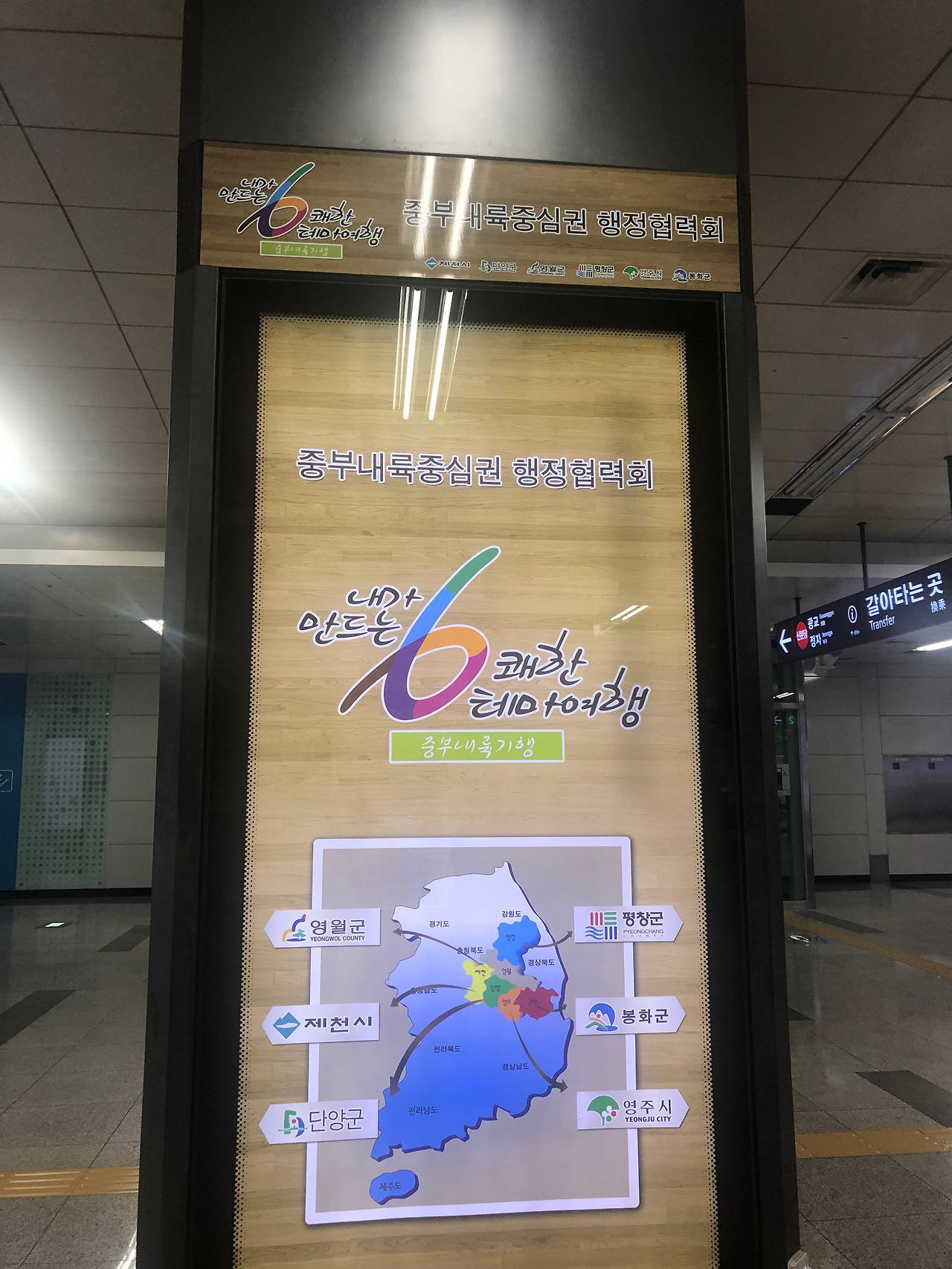 여행(旅行)을 미친 듯이 여행(勵行)하는 사회적 분위기 속에서 여행이 반드시 옳다! 여행을 가지 않으면 청춘이 아니다! 고 말하는 듯한 글을 하나 더 더하려는 것은 아니다. 사람마다 여행에 대해 다른 생각을 가질 수 있으니까. 다만, 여행을 좋아하고 떠나는 사람이라면 여행지의 아름다움이 어디에서 오는지에 대해 한 번쯤 같이 고민해봤으면 좋겠어서 타자를 두드리게 되었다. 내가 환승하는 길에 마주쳤던 여행 홍보는 사실 이렇다 할 대단한 홍보도 아니었다. 사진에 나와있듯이 중부내륙지방의 6개 시·군이 모여 행정협력회를 만들고 백두대간을 중심으로 공동협력사업이나 건설사업 등을 이룩하기 위해 출범한 단체에서 각각의 지역으로 여행 오라고 지역명만 언급해둔 간단한 홍보였을 뿐이다. 행정협력회에 포함되는 지역의 이름만 나와있을 뿐 각 지역에 어떤 것이 특색 있고 유명한 지조차 언급되지 않은, 홍보를 접한 사람이 자발적으로 찾아봐야 하는 그런 홍보. 그중에 영주시와 봉화군이 내 마음을 두드렸다. 여기 어떠냐며.