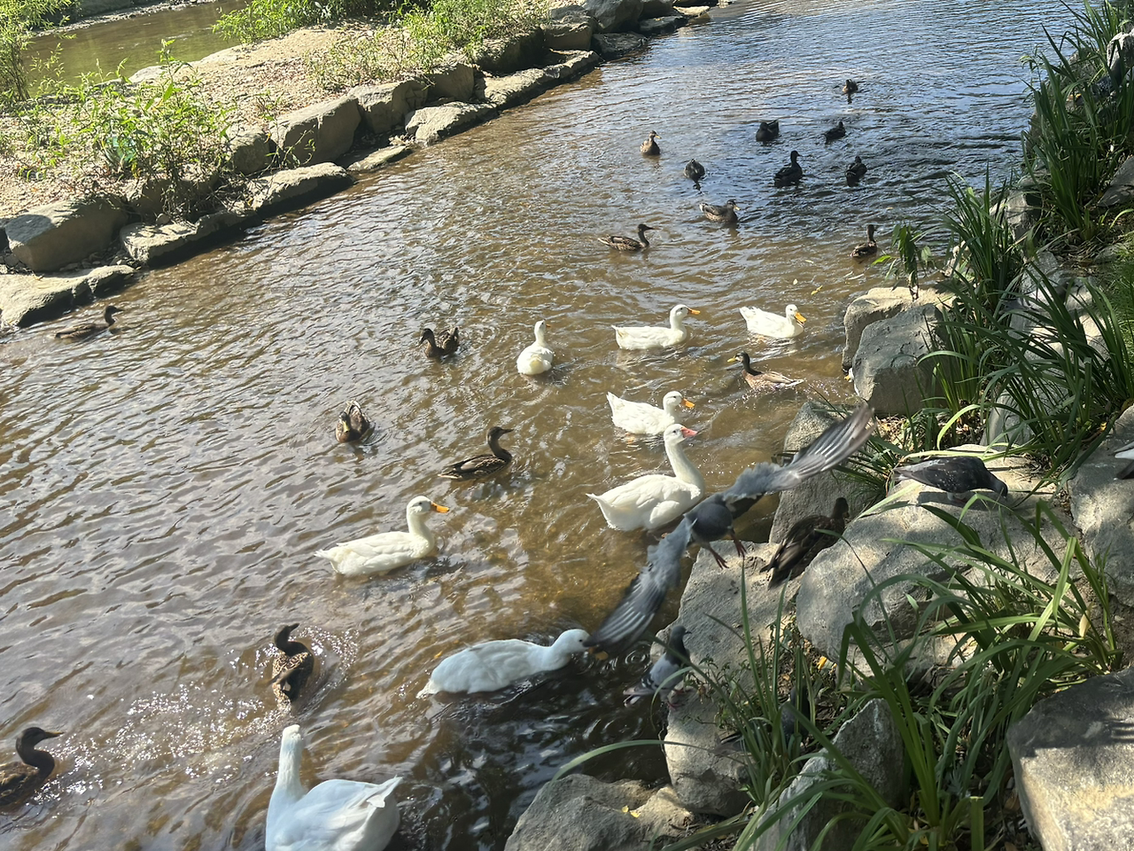 다음으로 향한 곳은 오리들의 아지트. 키만큼 무성하게 자란 수풀 사이 오솔길을 따라 들어가는데 평소에 와보지 못 한 곳이다. 흰 오리, 청둥오리, 블루스웨덴이라는 크고 검은 오리와 거위들까지 한데 뒤섞여 평화롭게 지내고 있었다. 배운걸 조잘조잘 얘기하길 좋아하는 딸이 수컷 청둥오리가 암컷보다 화려한 이유도 들려줬다. 이유가 뭐긴? 꼬실려고! 텃세 부리는 놈이 없어서 그런지 미운 오리 새끼는 안보인다. 산책 나왔다가 가끔씩 오리 한 마리 발견하면 그렇게 좋아했는데 여기 다 모여있었구나. 먹이를 뿌려주고 마지막 체험구간으로 향했다.