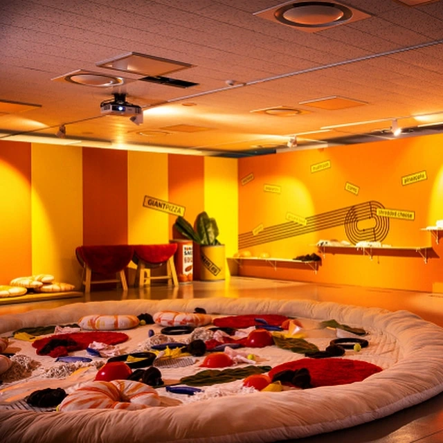 먼저 수영장만큼 넓은 폭신한 도우 위에 올라가 토마토를 한 줌 뿌린다. 아까 그 반짝이는 빨간 바가지가 토마토, 다이버의 노란 오리발은 파인애플, 권투 글러브는 옥수수 알갱이, 분홍 샤워타올은 베이컨, 검은 고무바퀴는 올리브, 넉넉한 크기의 동글납작한 방석은 페퍼로니, 올이 풍성한 하얀 대걸레는 파마산치즈로 변신한다. 하와이안 피자 완성!