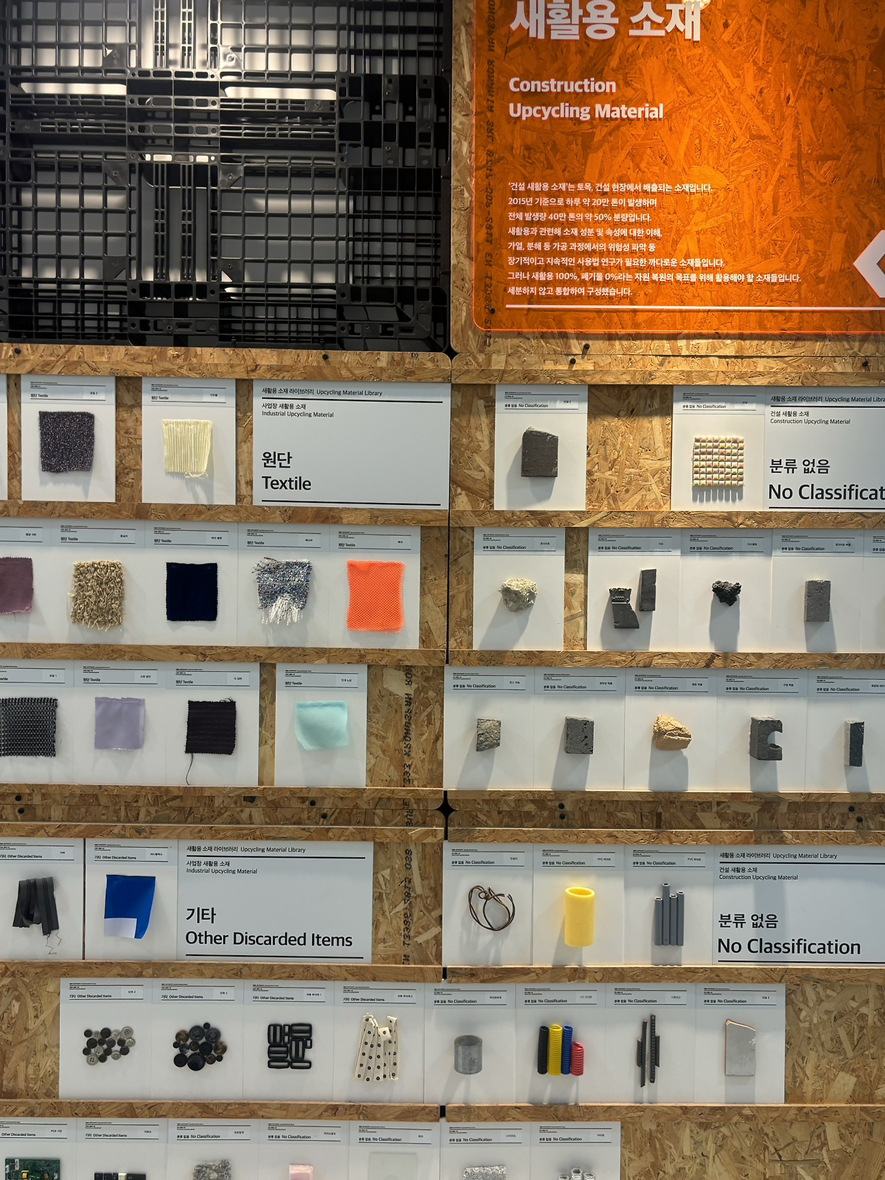 하루에 쏟아지는 의류 폐기물이 수 십 톤, 건설 폐기물이 수 만 톤에 달한다. 새활용 기업들은 이런 폐기물을 창작 소재로 활용하는데, 분류가 안 된 채 버려지는 경우가 많아 폐기물이 넘쳐나도 정작 재료수급이 어렵다고 한다. 그래서 이 곳에서는 새활용 소재의 원활한 수급과 제품 제작을 위해 소재은행과 메이커스페이스를 운영중이다. 소재은행에서 음료팩, 병뚜껑, 집게, 빨대, 호스, 옷걸이, 전선, 자투리 천, 장난감 부품 등도 잘 구분해 어느 정도의 덩어리를 갖춰놓으니 정말 꽤 그럴듯한 소재로 보였다. 아직 규모가 작지만 더 알려져 여러 공급원으로부터 다양한 재료를 충분히 모아 기업들이 개발하는 상품군이 다양해질 수 있을만큼 활성화 되면 좋을 것 같다. 이런 문제의식을 설득력 있는 아름다운 작품으로 꾸준히 완성해온 작가들의 노력도 다시 보였다. 무엇보다 이런저런 욕망이 좀 줄어들어도 좋을 것 같다.