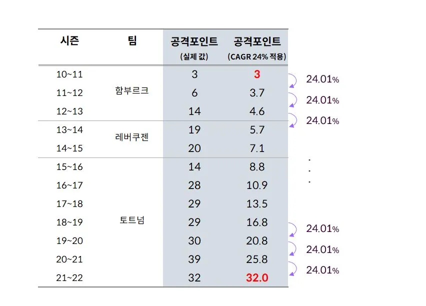 아닙니다. 그건 성장의 "총량"이지, 성장의 "추세"는 아닙니다. 우리는 [공격포인트가 매년 얼마나 증가했는지] 그 추세를 보고 싶은 거잖아요. 그렇다면 위의 표에다가 매년의 증가율을 좀 추가해 봐야겠습니다.