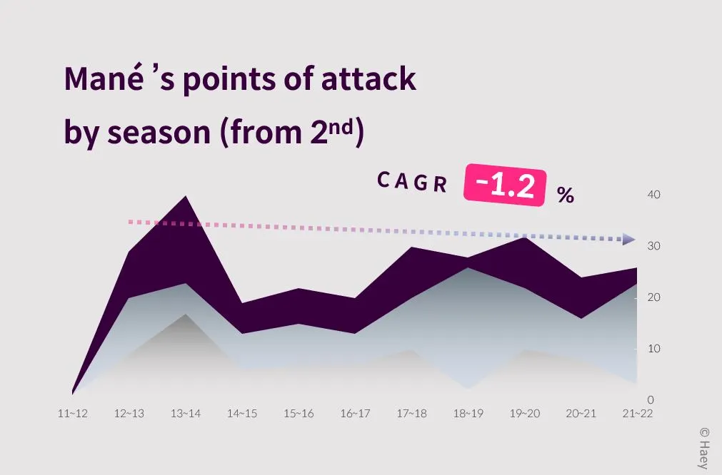 마네의 경우, 공격포인트가 거의 없었던 첫 시즌을 제외하고 두 번째 시즌부터 CAGR을 다시 산정하면 -1.2%가 나옵니다.