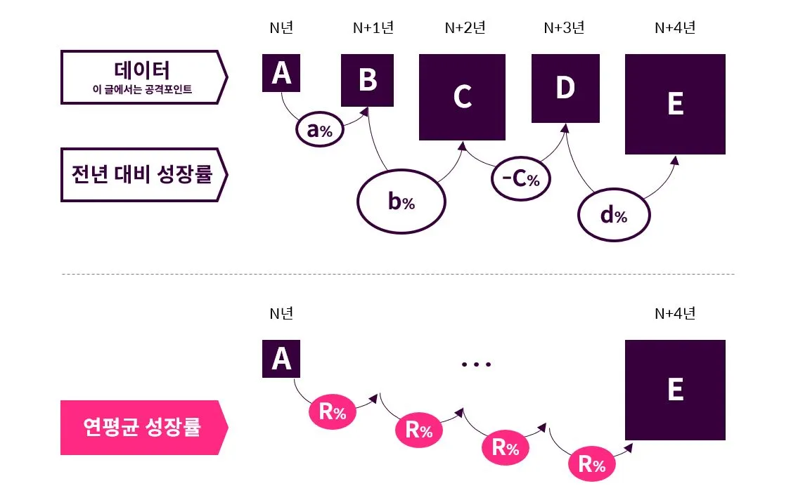 단, 주의할 점이 있습니다. CAGR을 쓰고 싶을 땐, 우선 데이터들을 간단하게라도 차트로 만들어서, 꾸준한 성장이 있었는지 시각적으로 한번 확인한 후에 사용 여부를 결정하셔야 합니다. CAGR은 매년 꾸준히 성장세가 보일 때 써야지, 매년 널뛰기가 너무 심할 때는 연평균 성장률이 몇 % 다 보여주는 것이 자칫 데이터를 곡해하여 피보고자에게 허위 보고를 한 셈이 될 수도 있습니다.