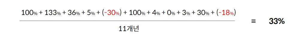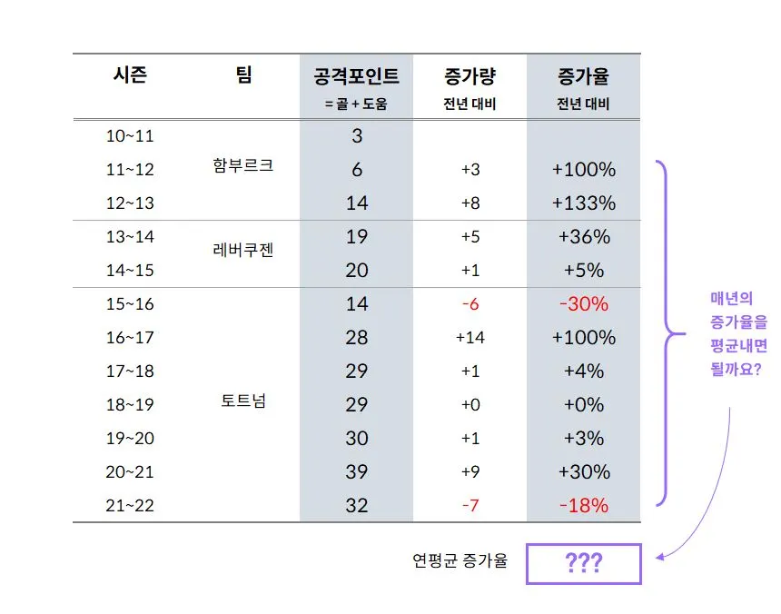 즉, "손흥민이 매년 평균 33%의 추세로 성장해왔다"라고 말하면 거짓말이 된다는 겁니다.