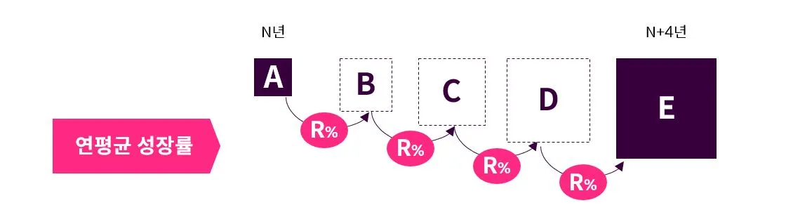 연평균 성장률은 복리(複利)의 개념입니다. 위 그림을 보면, 첫 데이터 A에서 R%만큼 증가한 수에 또 R%를 증가시키고 이걸 반복하다가 마지막에 E가 나오게 되는 그때의 R이 몇%냐. 이게 연평균 성장률 CAGR의 개념입니다.