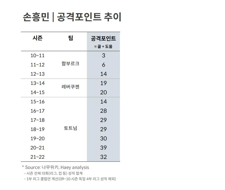 우선, [성장]이라는 말은 너무 광범위하네요. 퍼스트 터치, 공간 이해력, 멘탈 등등 성장을 논할 요소는 무궁무진하므로, 그냥 결과만 놓고 보겠습니다. 공격수의 Output이라 할 수 있는 [공격포인트]가 매년 얼마나 증가했는지 그 추세를 성장이라고 전제해봅니다.
