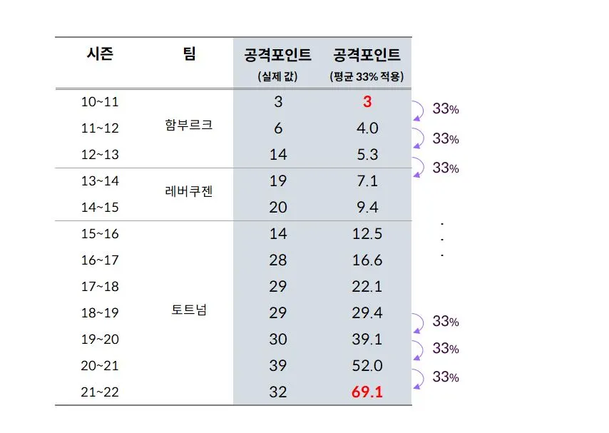 그럼, 손흥민은 매년(시즌당) 33%의 성장세를 보였다...라고 하면 맞을까요?