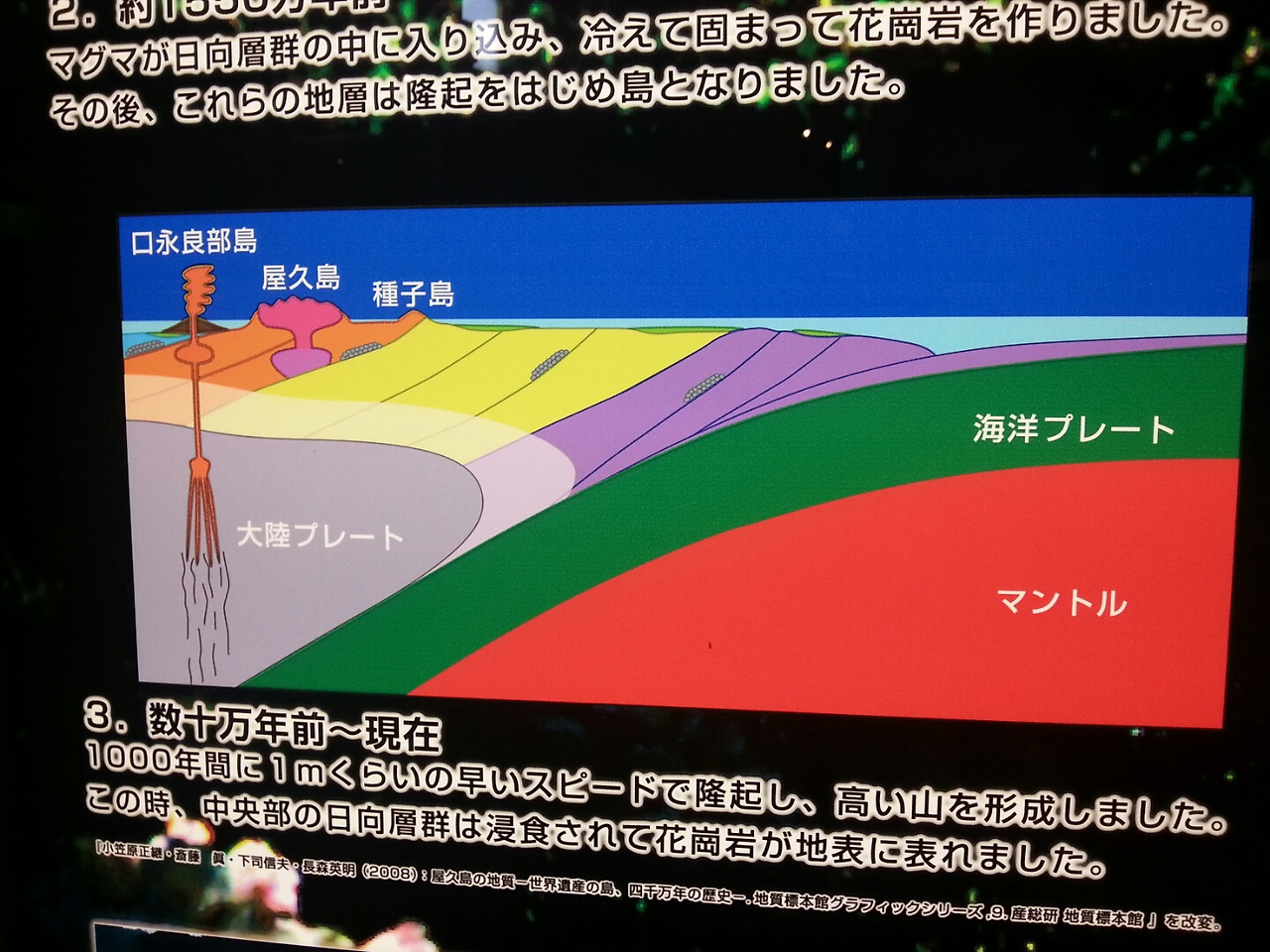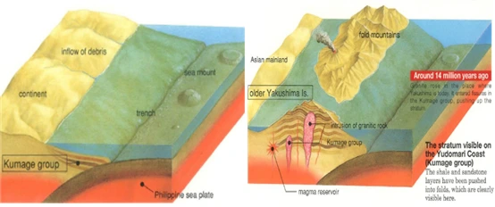 야쿠시마 섬은 많은 지역이 화강암으로 구성되었으며 특히. Maekdake부터 Okudake까지는 화강암으로만 이루어진다. 야무시마 화강암은 원주형 블록으로 쉽게 쪼개진다. 이것은 지표 아래에서 화강암이 서서히 냉각을 하는 결과로서 유발된다. 지하 화강암은 1,000년 마다 1미터 씩 빠른 속도로 솟구친다. 이는 많은 비로 인한 침식에도 불구하고 지상에 화강암지대를 나타나게 했으며 이는 높은 산으로 이루어진 섬을 탄생시킨 것이라 볼 수 있다. 제주도와 같이 화산 폭발로 생성된 후 지층이 융기되어진 섬이다. 새벽에 느꼈던 먼 땅에서 전해져 온 흔들림의 이유를 유추해볼 수 있었다.