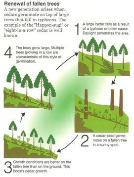 (좌)고사목 기반한 수목 식재 예시 (출처 : Diagram Yakushima) (우)고사한 삼나무를 기반으로 자라나는 수목