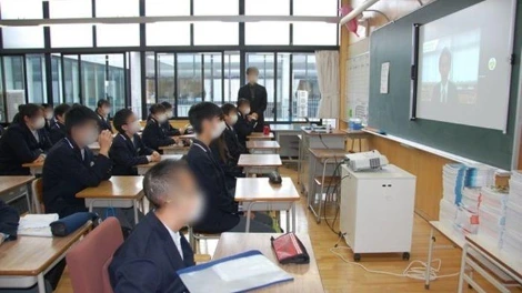 사진의 각도를 바꾸자,앞의 사진에서는 보이지 않던 사람이 보인다. 바로 선생님의 모습이. 그제서야 이 장면이 우리에게도 그렇게 낯설지 않은 상황이라는 걸 금방 확인할 수 있다. 교장 훈화라거나 혹은 성폭력 예방 교육, 흡연 예방 교육, 이런거 할때 방송실에서 강사가 수업 진행하고 학생들은 그걸 방송으로 보면서 선생님이 임장지도하는 모습. 정상적으로 학교 다닌 사람이라면 수없이 경험했을 바로 그 장면이다. 결국 일본이나 우리나 다를 바가 없었던 것이다.