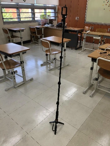 자, 이제 뭘로 찍을까? 이때 까지만 해도 4월 6일에 개학 할 것이라 생각했기 때문에 거창한 장비를 따로 돈 들여 사기에는 아까웠다. 작년 한해 무급 휴직을 했고, 코로나 때문에 펀드도 박살이 나서 그럴 돈도 없었다. 그래서 일단 2년 반 된 아이폰 8 플러스를 노인 학대 수준으로 굴리기로 했다. 2년 전에 샀지만 거의 사용하지 않아 먼지가 잔뜩 낀 셀카봉을 찾아 최대 길이로 잡아 늘렸다.얼추 삼각대 모양이 나왔다.