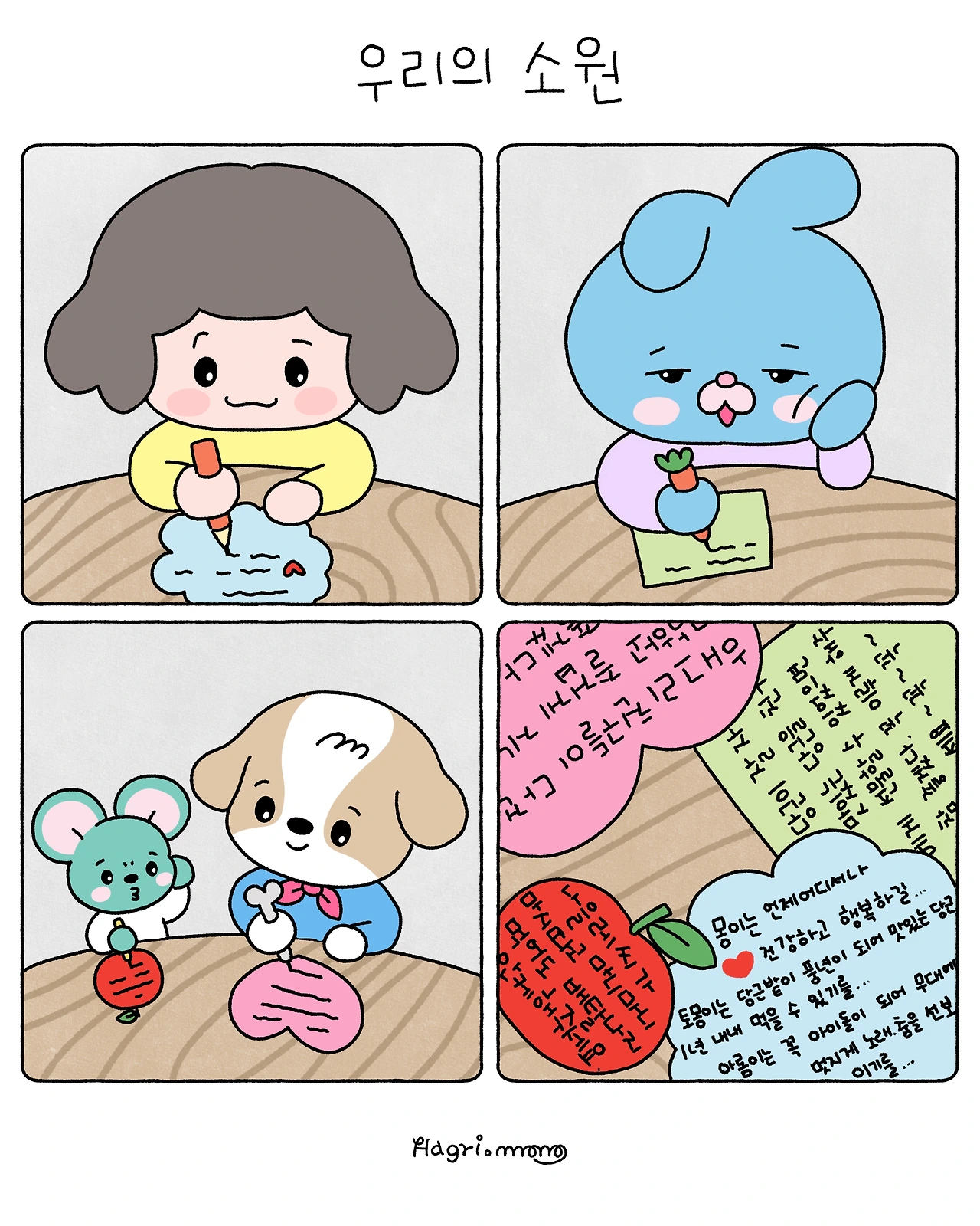 해그리마을에서 벌어지는 '몽'이와 '나을래씨', 그리고 그 친구들과 함께 살아가는 '너와 나의 세상'을 그리고 씁니다.